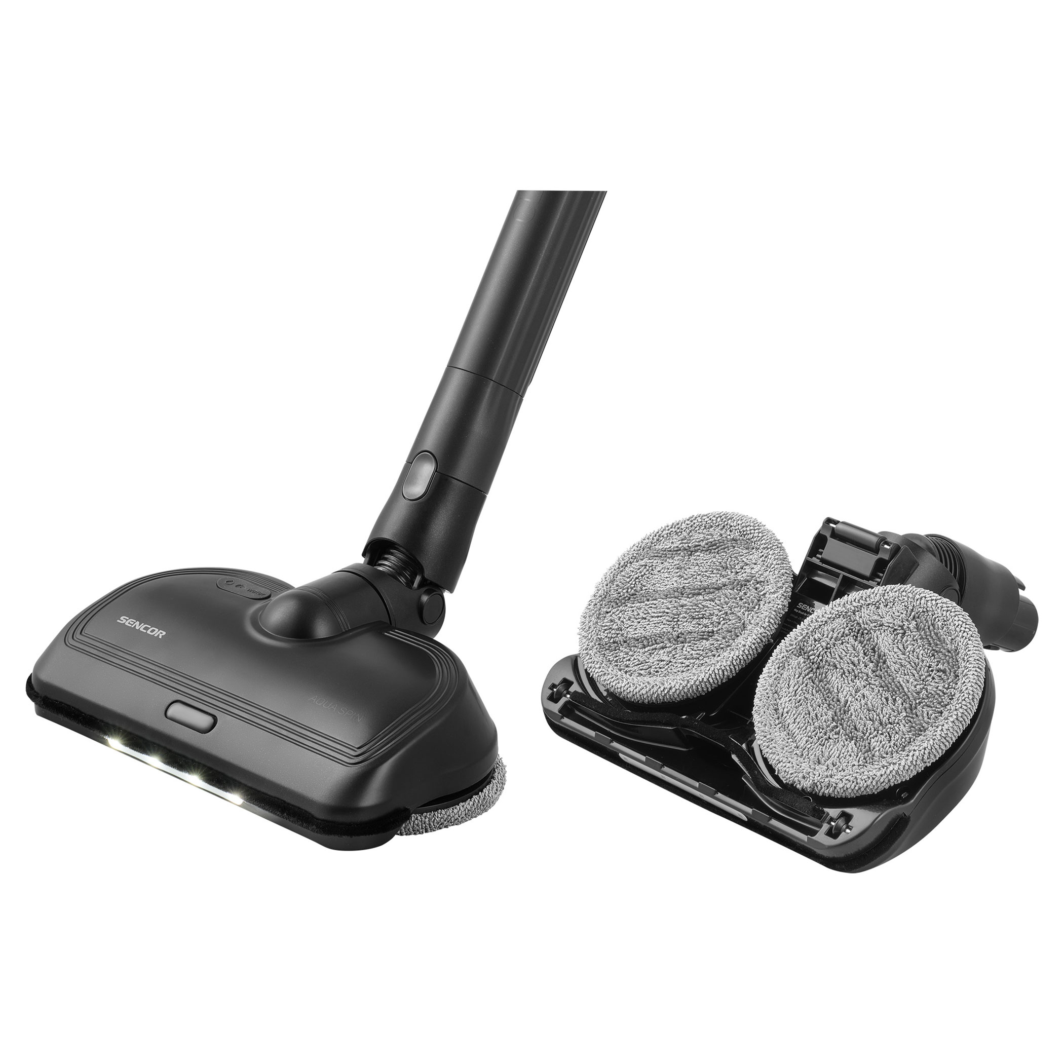 - Vacuuming and moping at the same time: Aqua Spin Power Mop with two rotating mops and lighting vacuums and mops at the same time