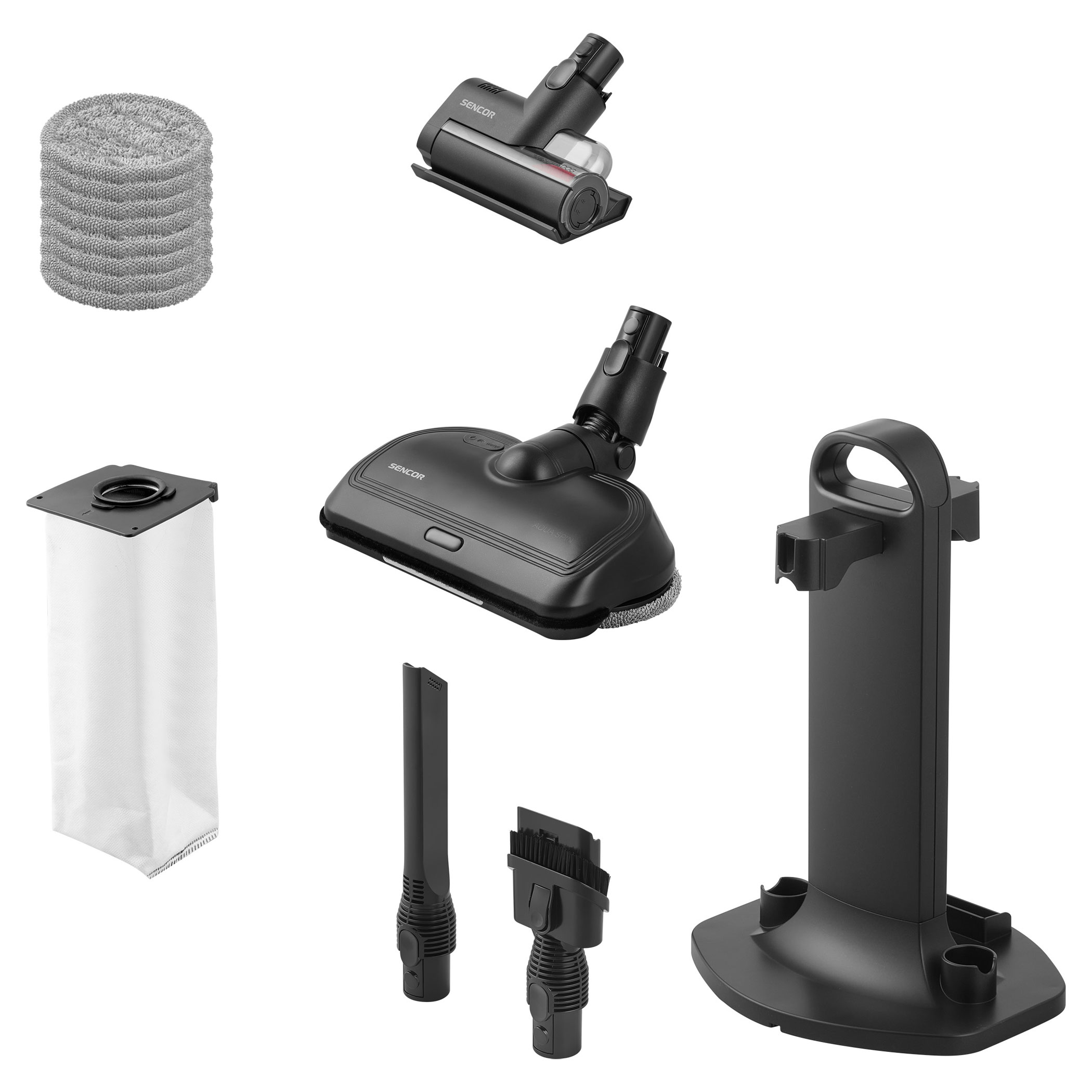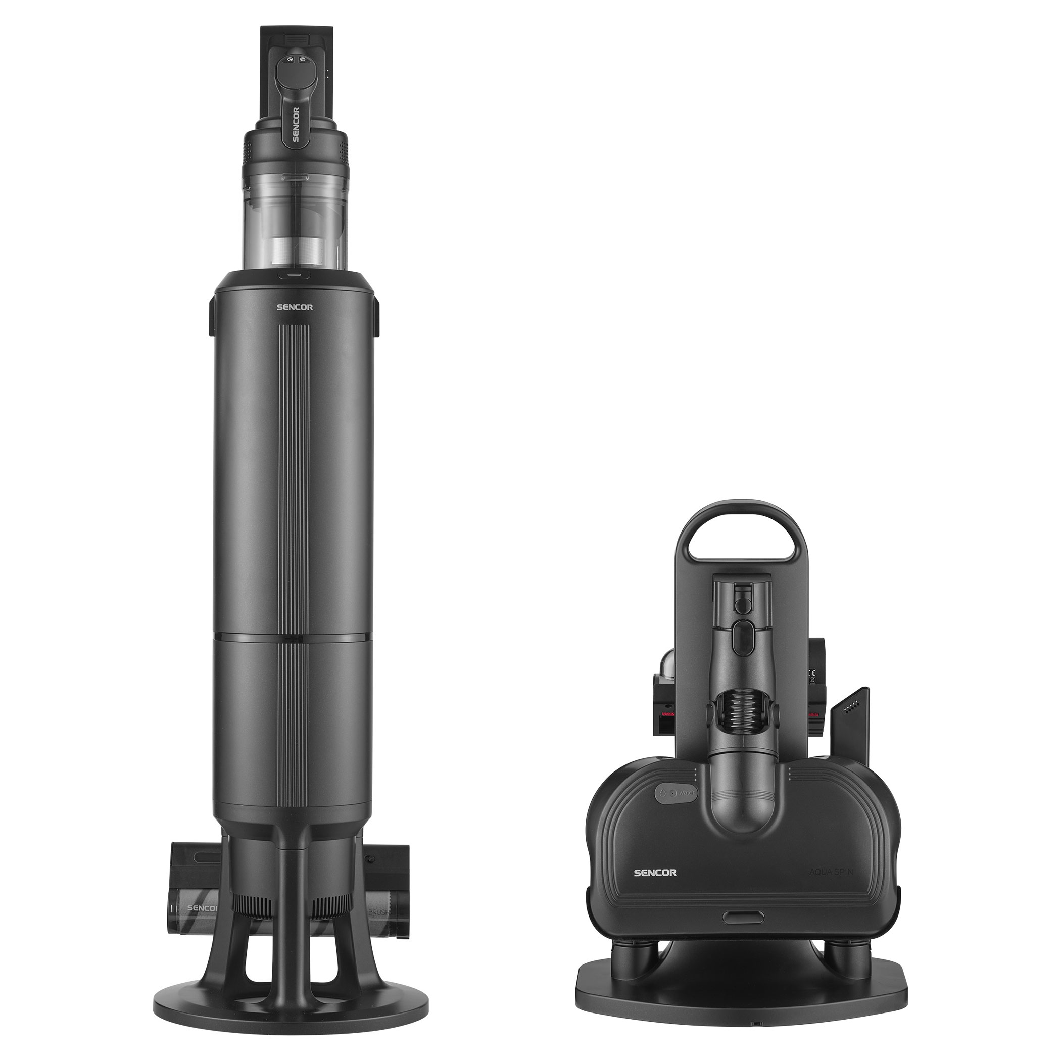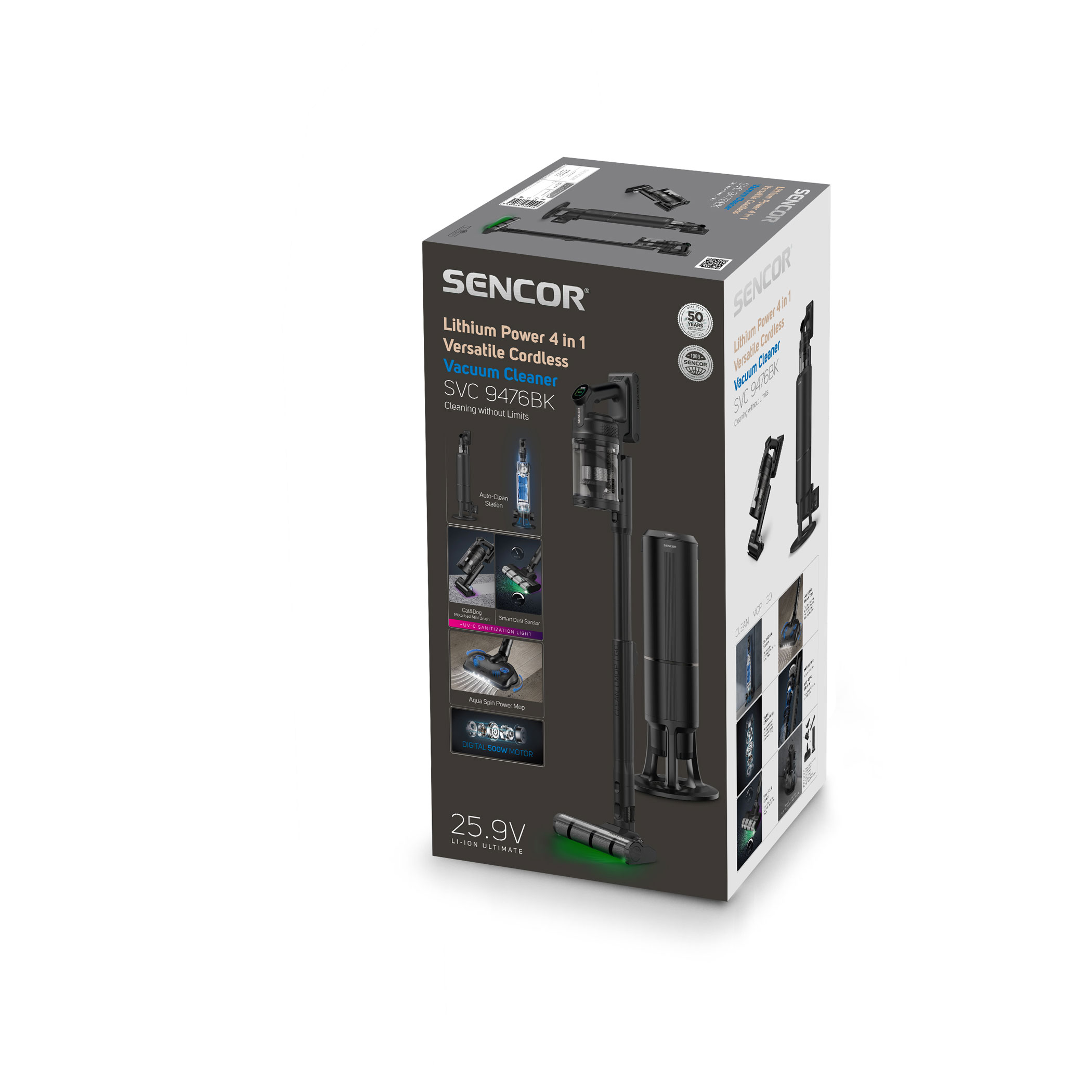 The SVC 9476BK is powered by 500 W digital motor and multi-cyclone filtration with HEPA H13 for powerful and long-lasting suction performance. The Smart Dust Sensor automatically adjusts suction power according to the level of dirt, optimizing energy consumption and extending operating time. Maximum runtime at the basic power level is up to 55 minutes. The motorized floor nozzle with MicroDust Vision LED lighting and UV-C sterilization reveals dust and disinfects surfaces. The Aqua Spin mopping nozzle allows vacuuming and mopping in one step, while the Cat & Dog motorized rotary brush with UV-C technology deeply cleans upholstery and mattresses, removing not only hair and pet fur but also bacteria and dust mites.Key features: