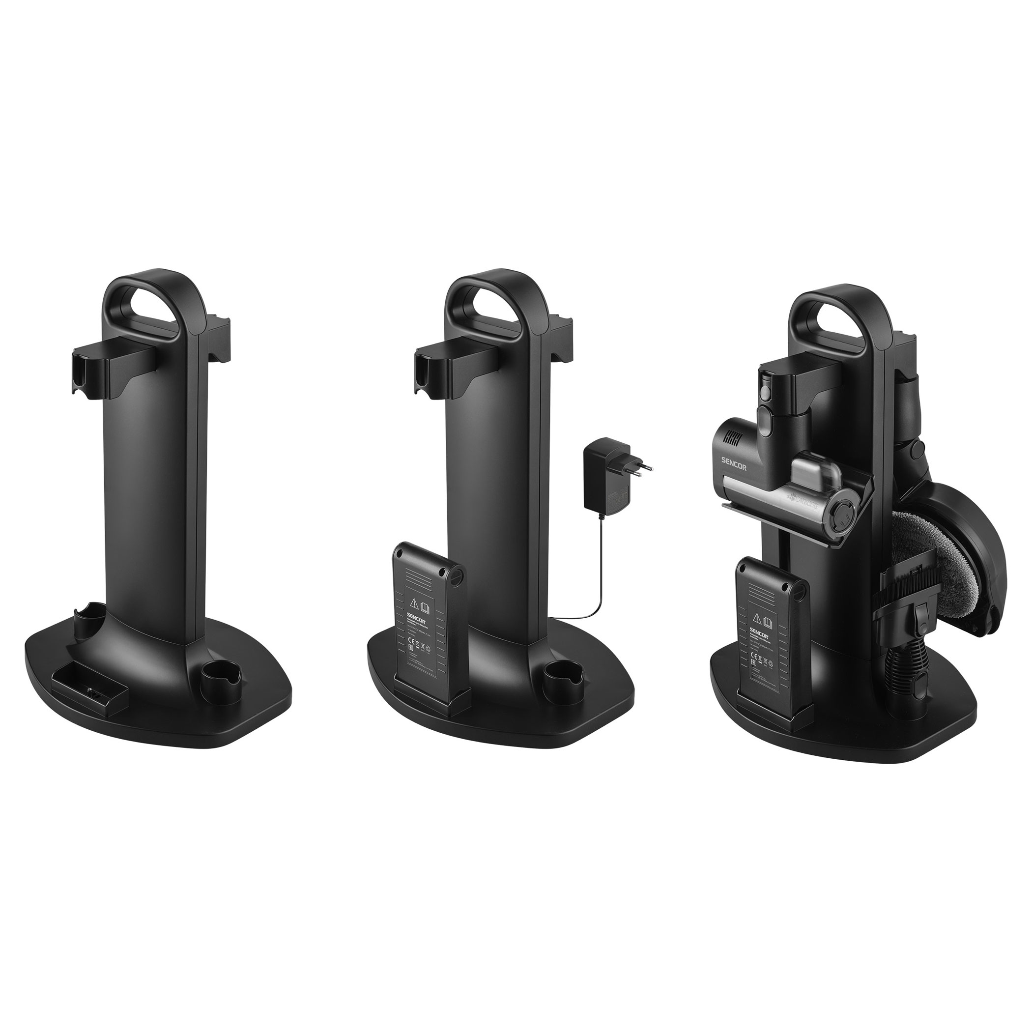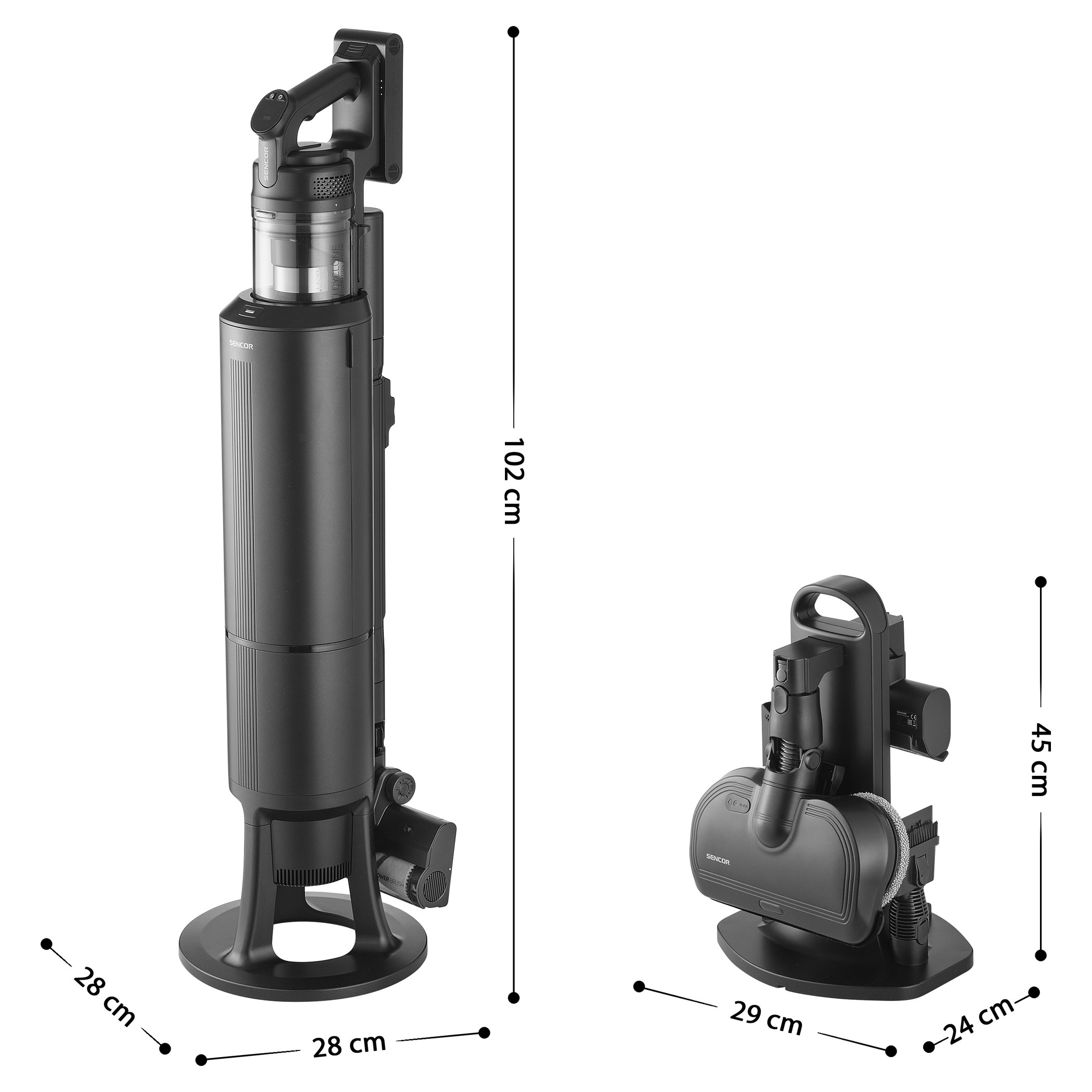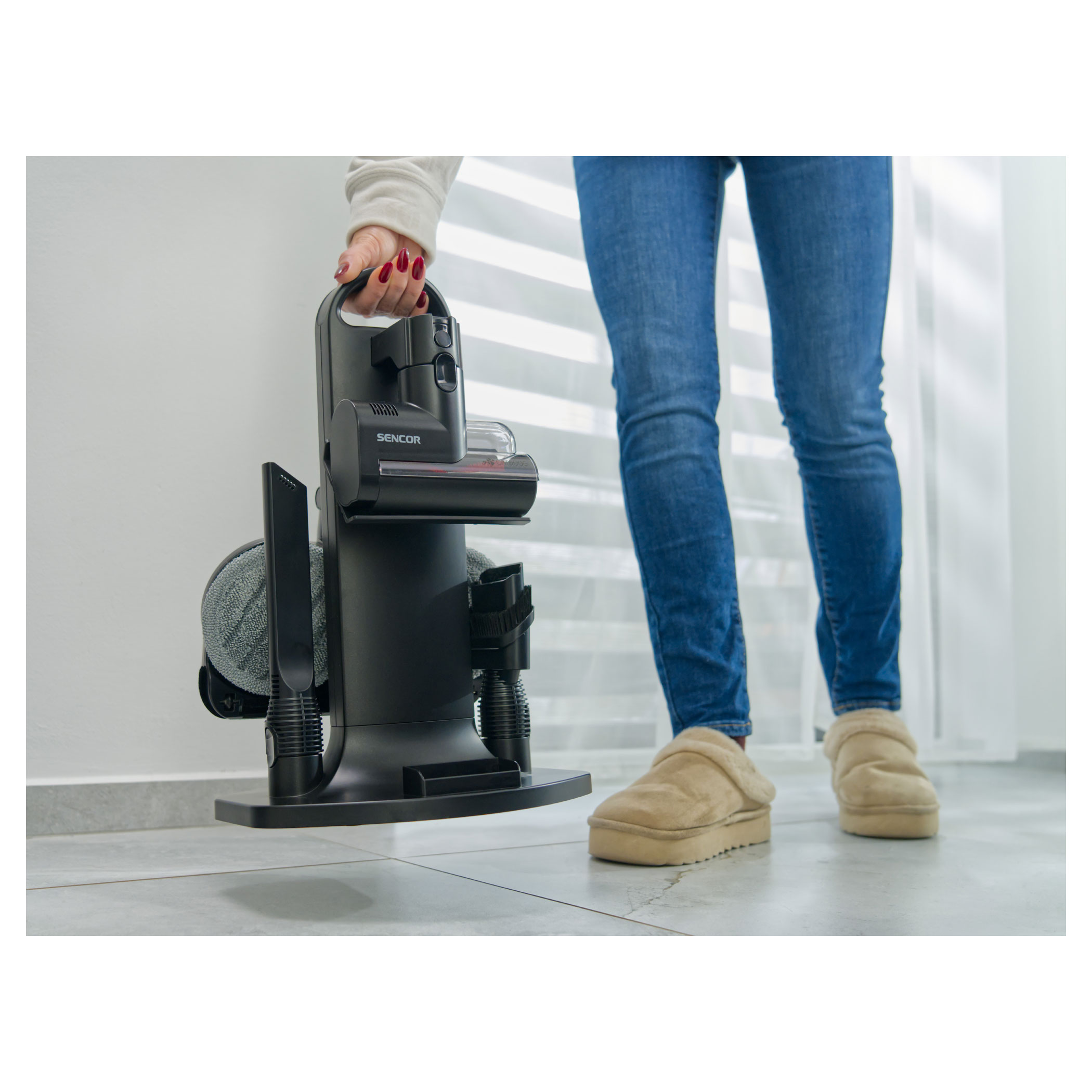 The SVC 9476BK is powered by 500 W digital motor and multi-cyclone filtration with HEPA H13 for powerful and long-lasting suction performance. The Smart Dust Sensor automatically adjusts suction power according to the level of dirt, optimizing energy consumption and extending operating time. Maximum runtime at the basic power level is up to 55 minutes. The motorized floor nozzle with MicroDust Vision LED lighting and UV-C sterilization reveals dust and disinfects surfaces. The Aqua Spin mopping nozzle allows vacuuming and mopping in one step, while the Cat & Dog motorized rotary brush with UV-C technology deeply cleans upholstery and mattresses, removing not only hair and pet fur but also bacteria and dust mites.Key features: