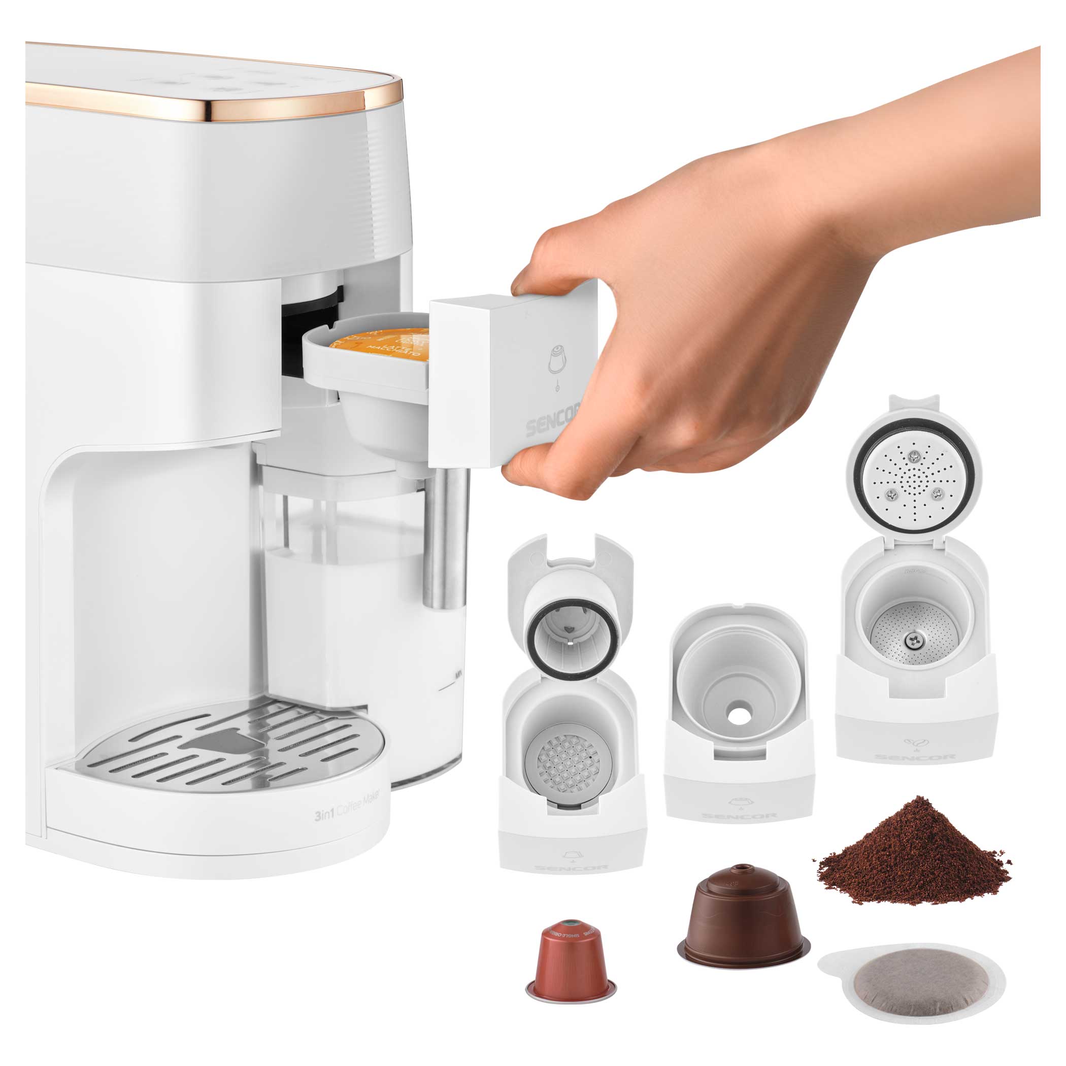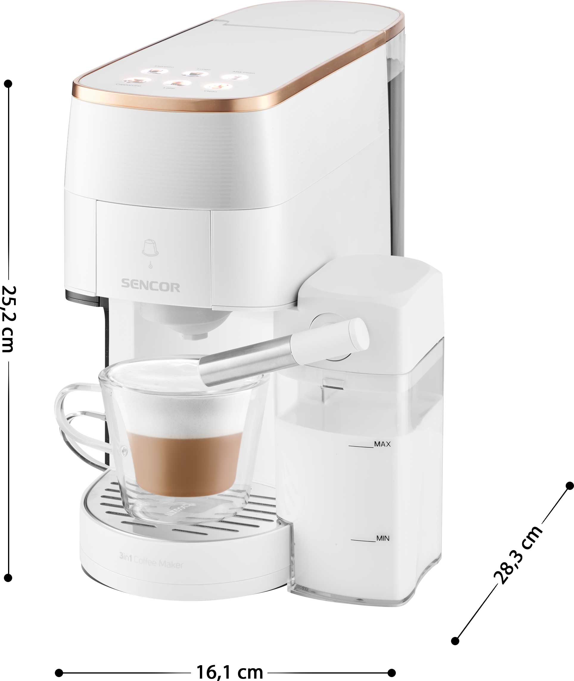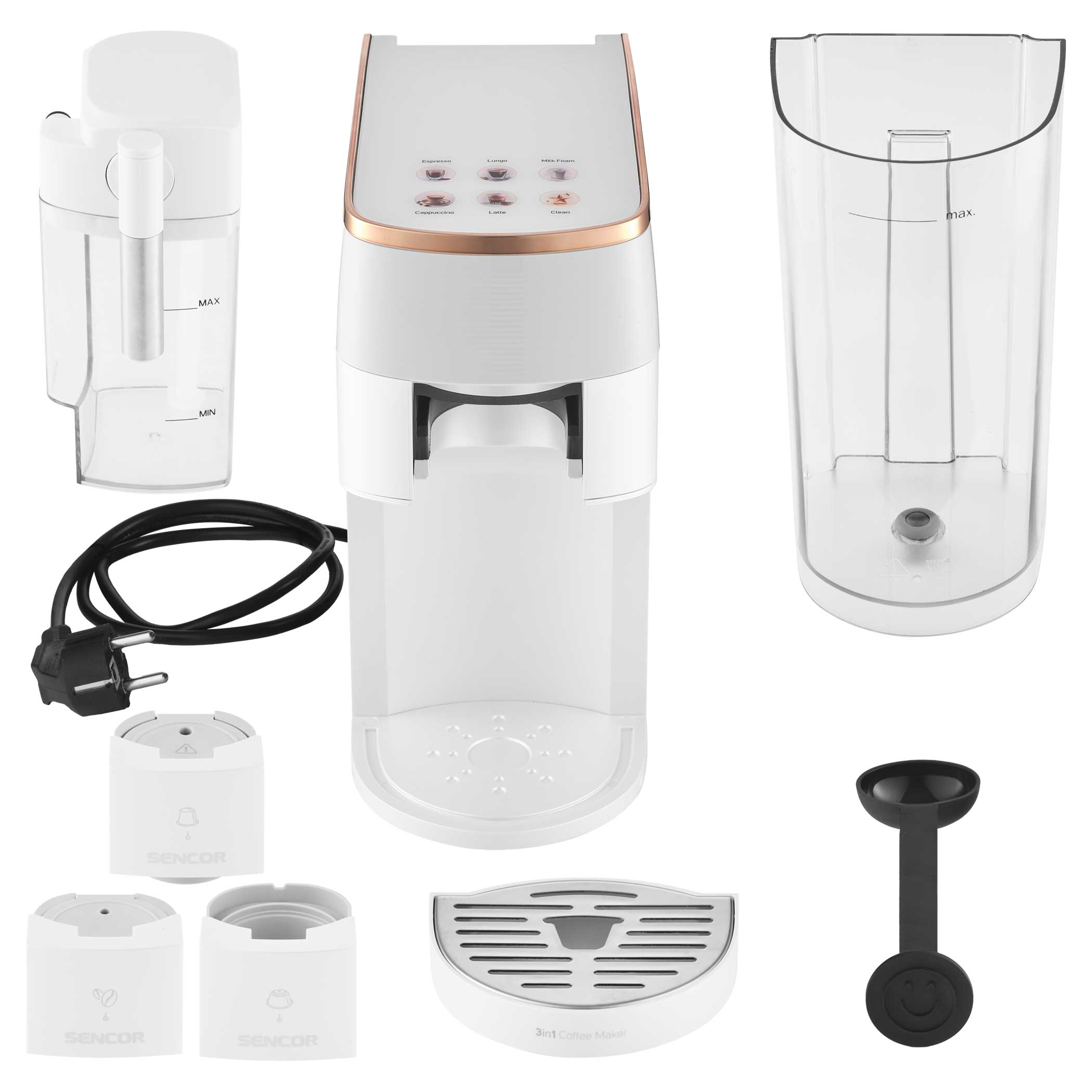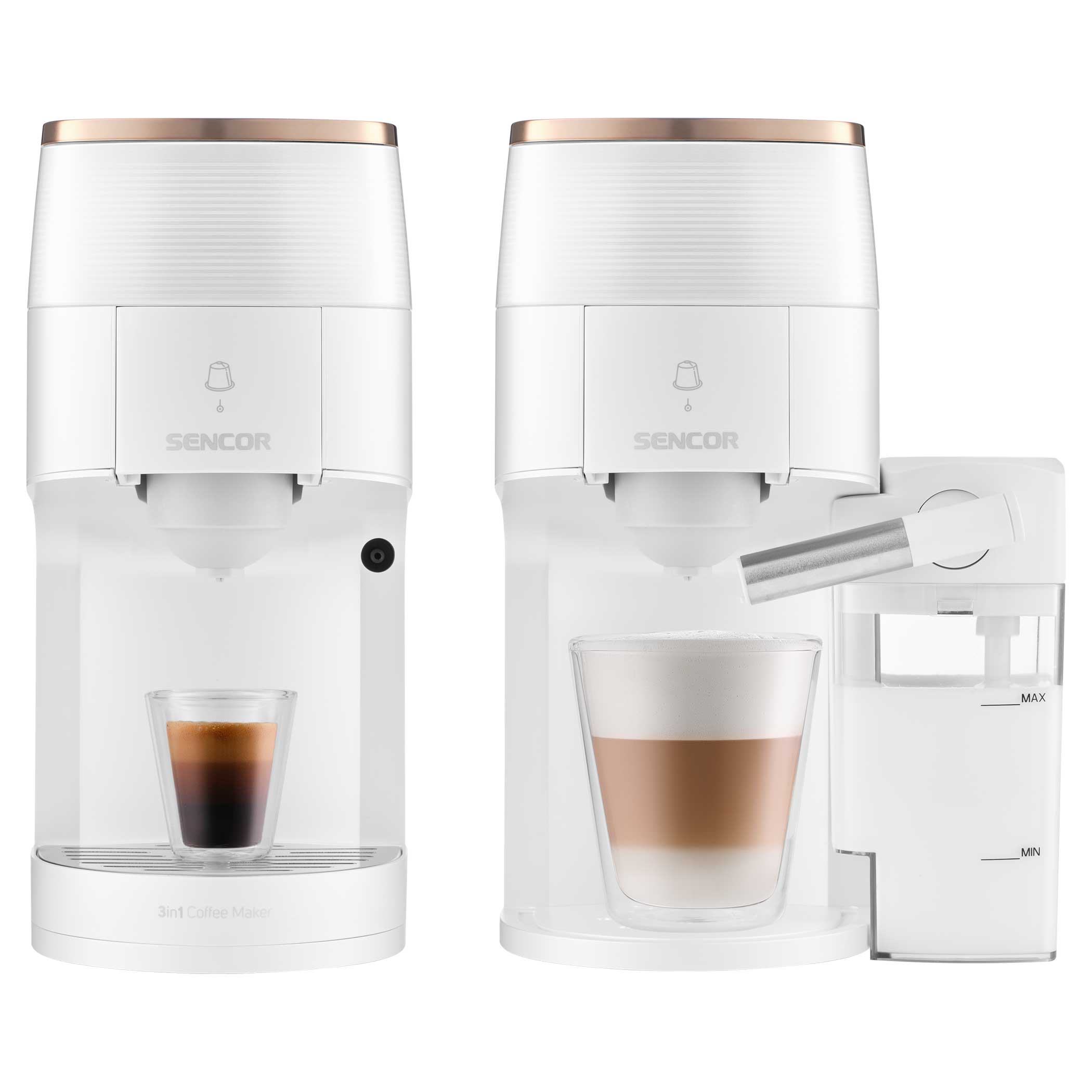 Discover the endless possibilities in coffee preparation with the Sencor SCC 3000BK multi- capsule Espresso machine, which will prepare delicious coffee easily, quickly and with high quality. Choose from a wide range of Nespresso® Original*, Nescafé® Dolce Gusto®* or any brand of ground beans, depending on your preference. The colour display makes it easy to choose your favourite beverage with just one touch. Professional quality is backed by a powerful 19 bar pump and Thermoblock water heating system. The coffee machine is equipped with a milk tank for automatic milk frothing and easy cleaning with automatic flushing. Because of its compact size, you can also get it for smaller apartments.