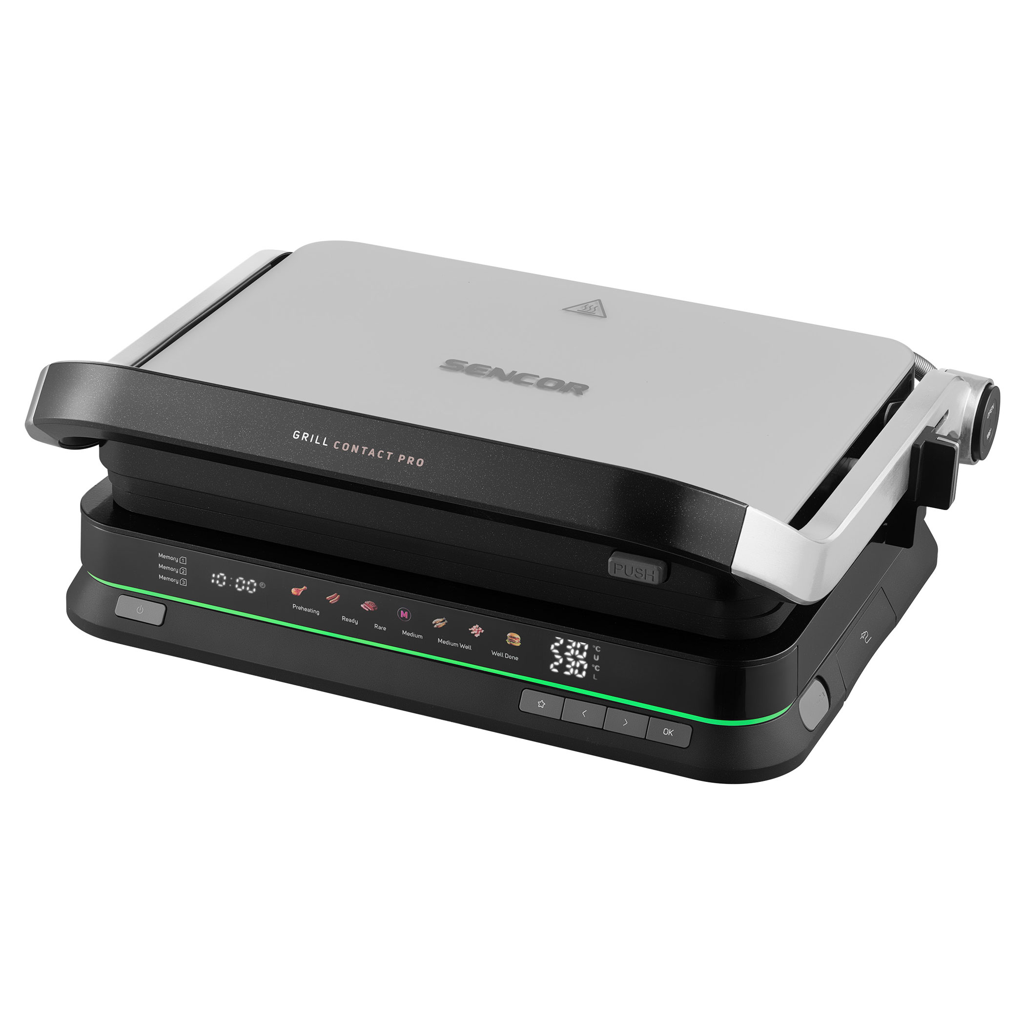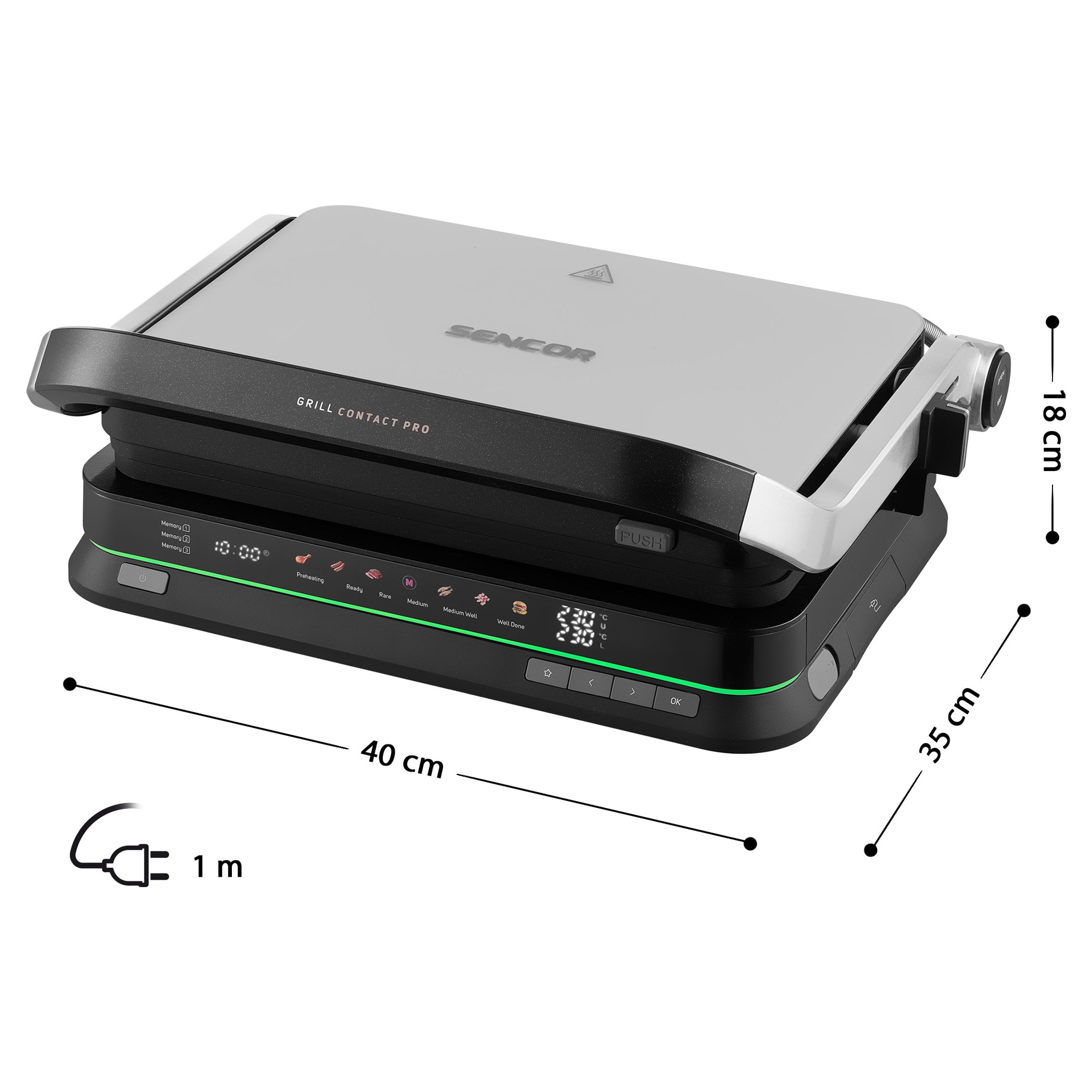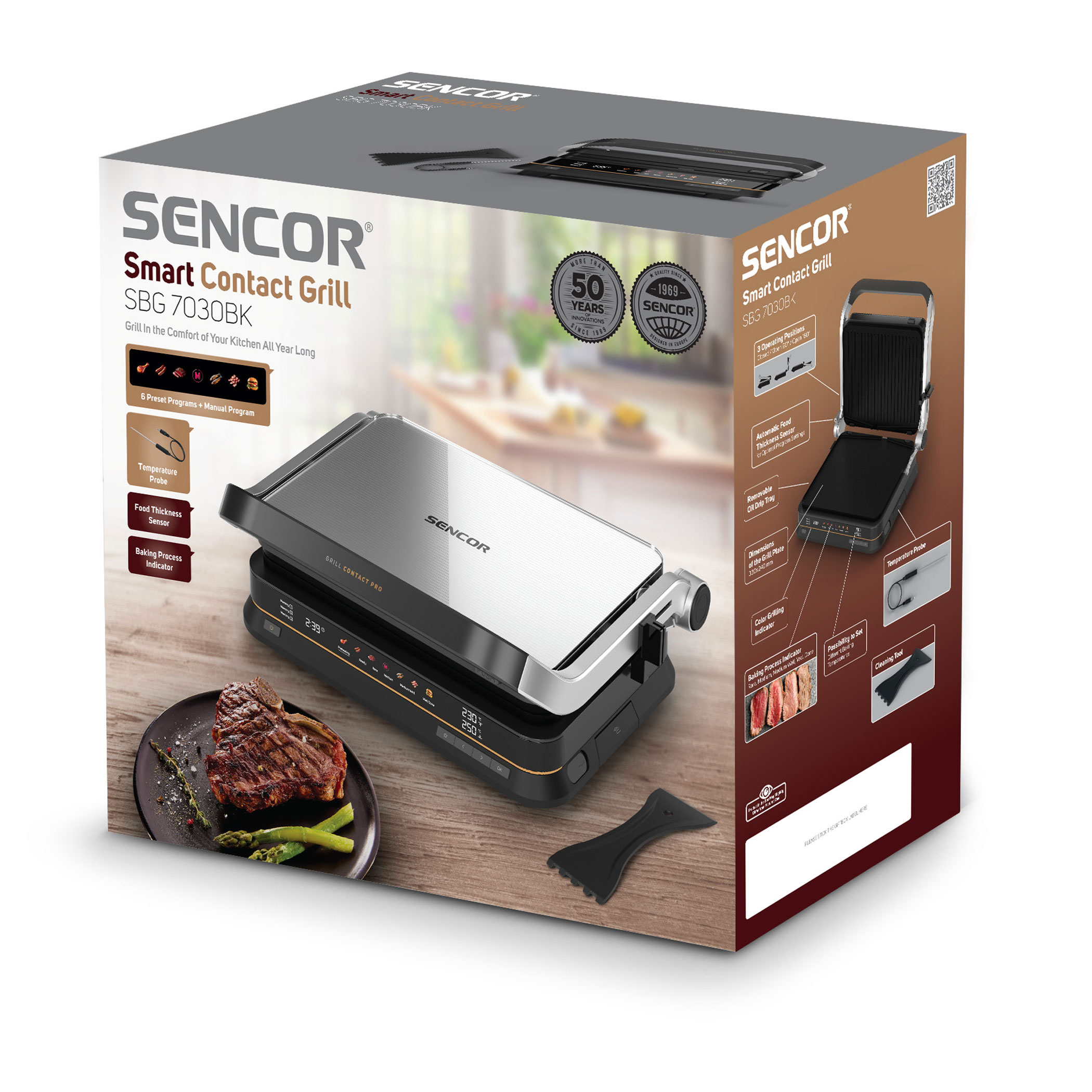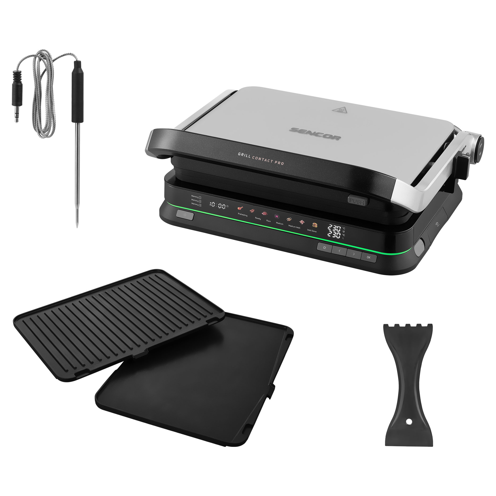 The Sencor SBG 7030BK contact grill allows easy preparation of juicy meat, burgers, fish, grilled vegetables and many other favourite dishes. Thanks to the intelligent sensor, it detects the thickness of the food and automatically adjusts the grilling time, while the doneness indicator clearly shows the current cooking level. The clear display ensures easy and intuitive operation. The grill also features 6 automatic programs, a temperature probe for precise cooking control and a maximum temperature of 250 °C. It can be used in three positions and the removable grill plates make cleaning very easy.