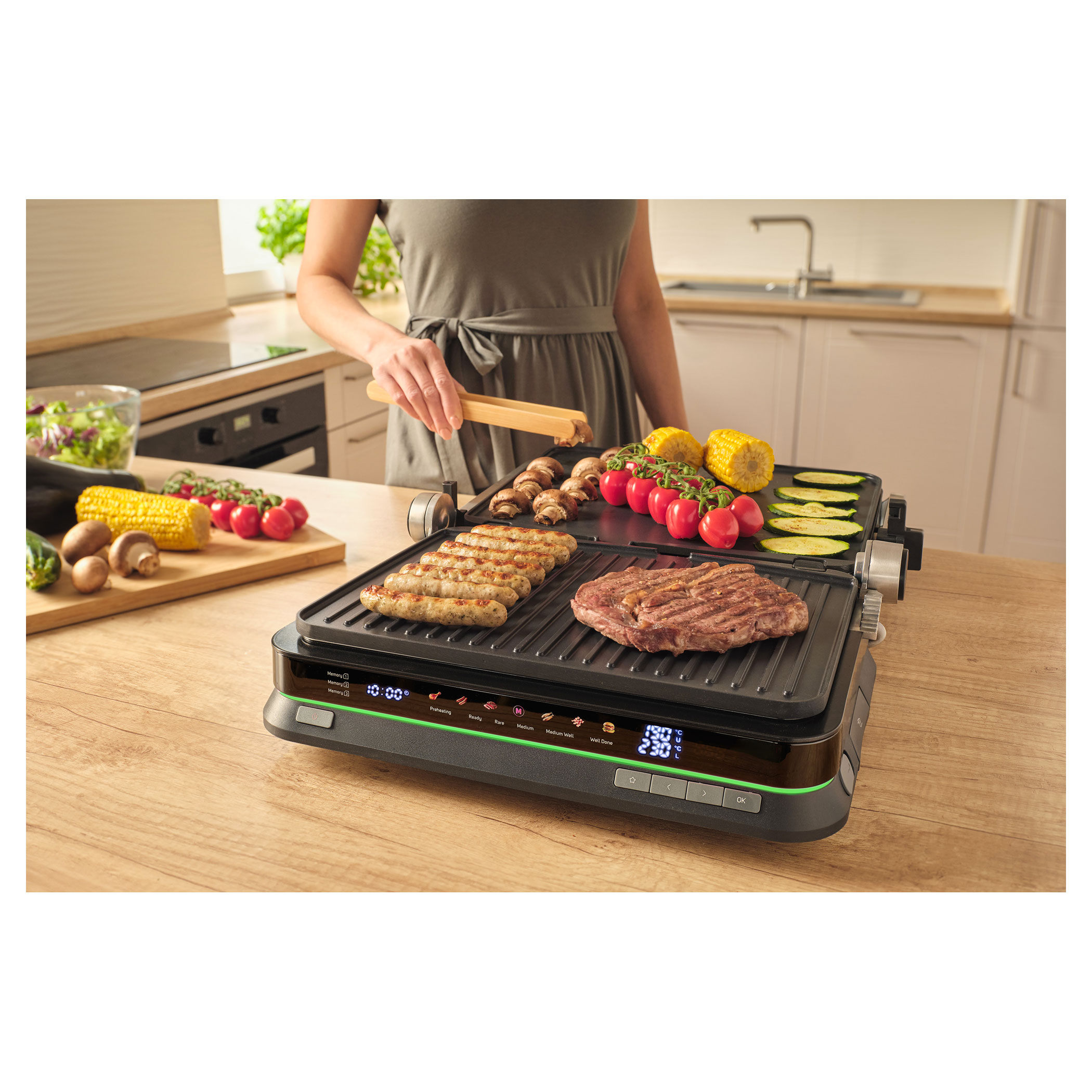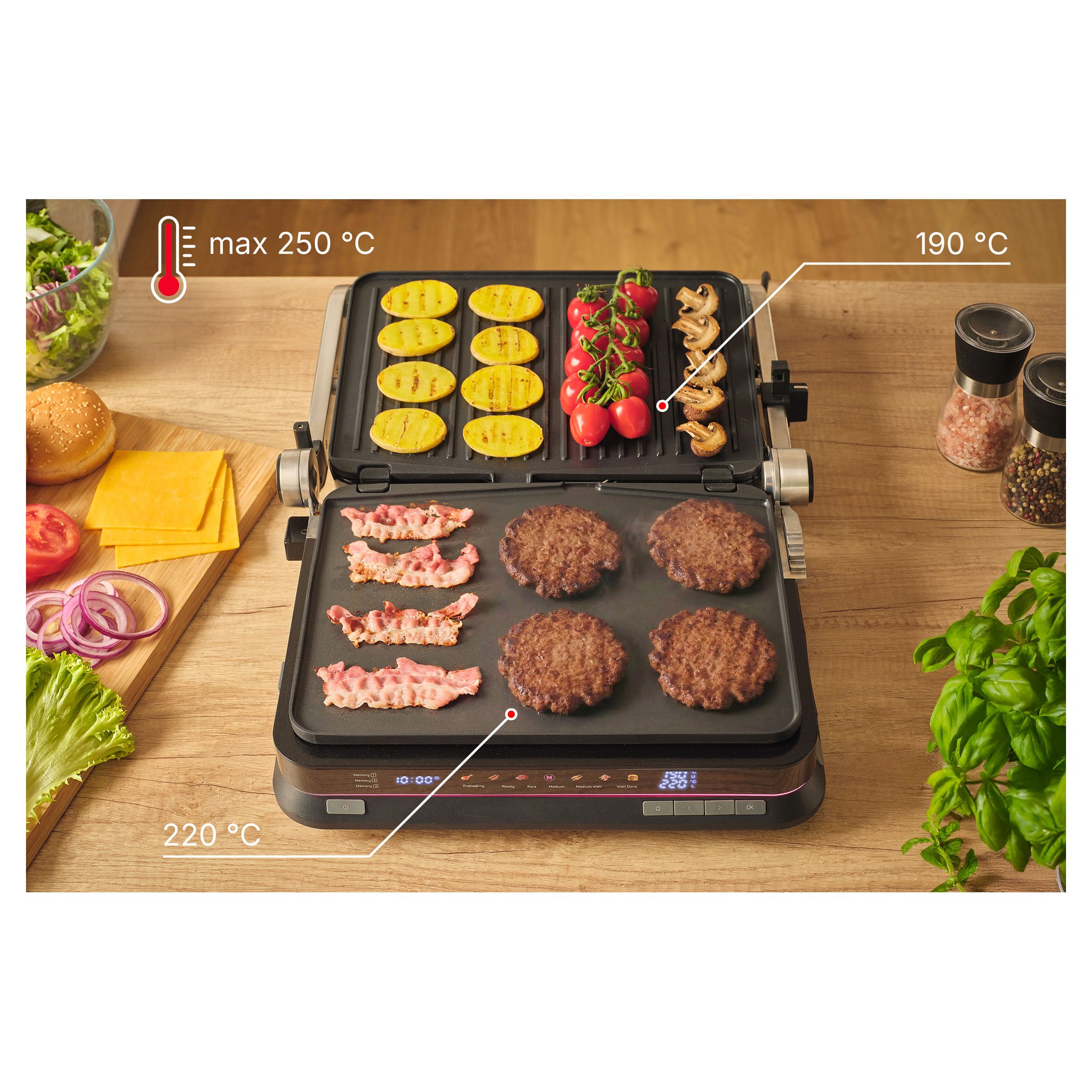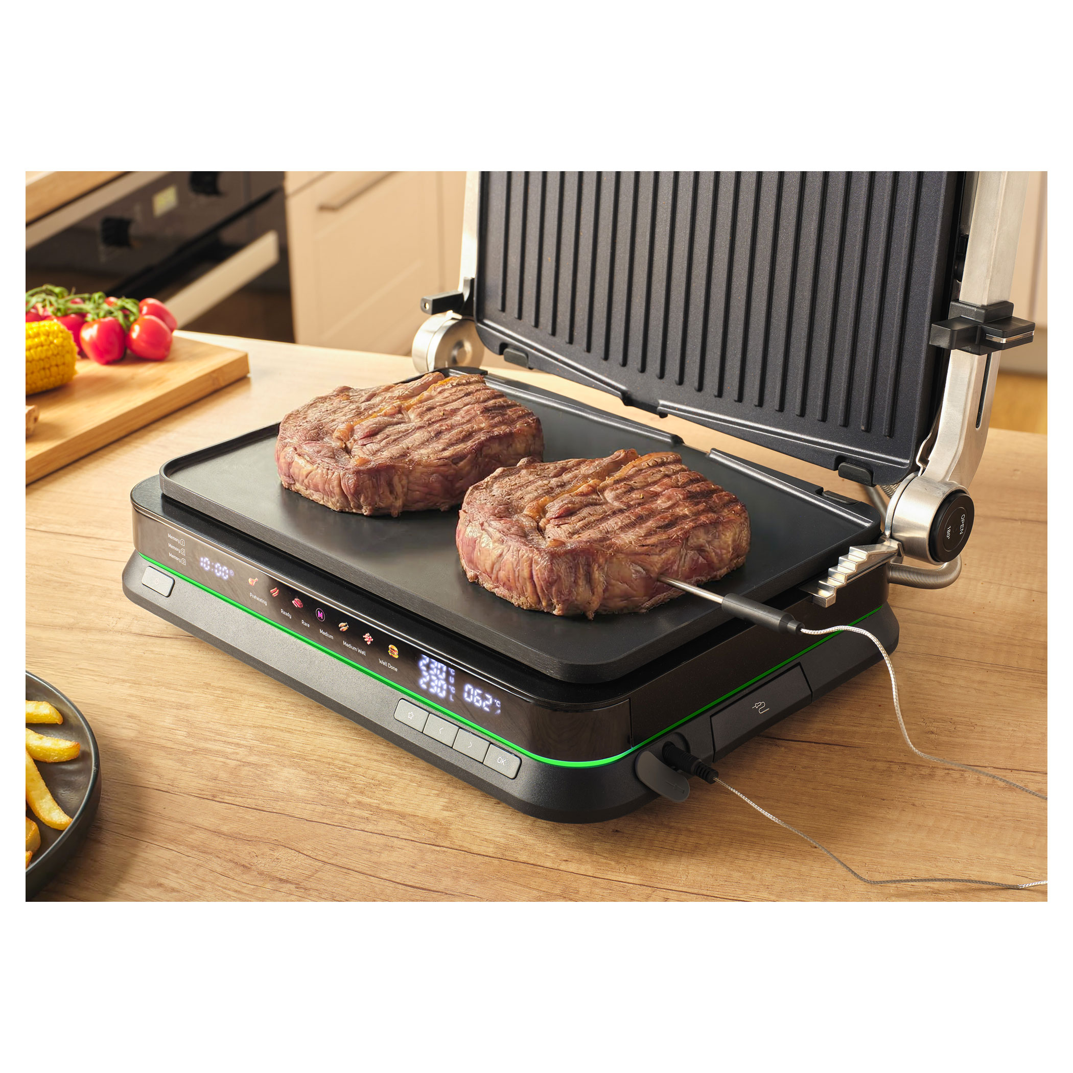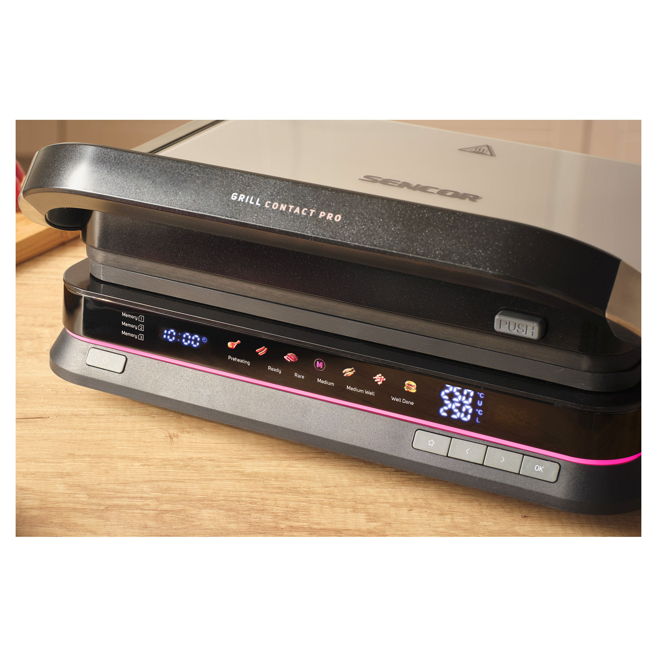 The Sencor SBG 7030BK contact grill allows easy preparation of juicy meat, burgers, fish, grilled vegetables and many other favourite dishes. Thanks to the intelligent sensor, it detects the thickness of the food and automatically adjusts the grilling time, while the doneness indicator clearly shows the current cooking level. The clear display ensures easy and intuitive operation. The grill also features 6 automatic programs, a temperature probe for precise cooking control and a maximum temperature of 250 °C. It can be used in three positions and the removable grill plates make cleaning very easy.