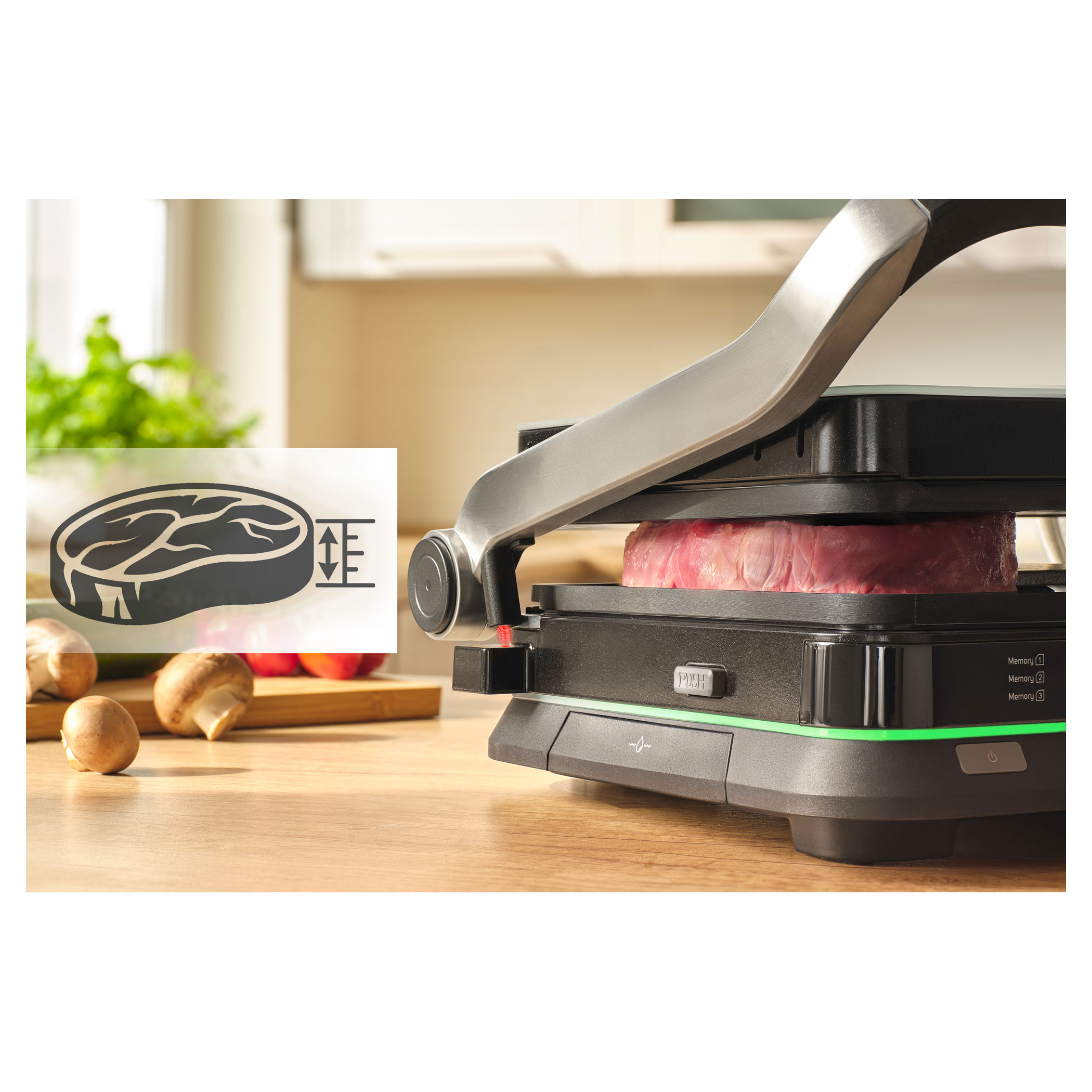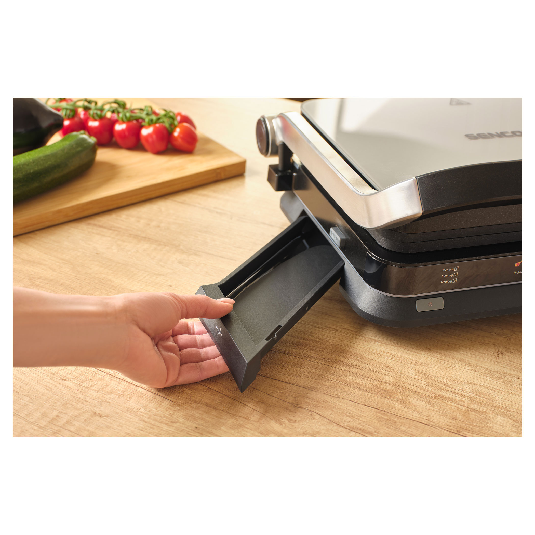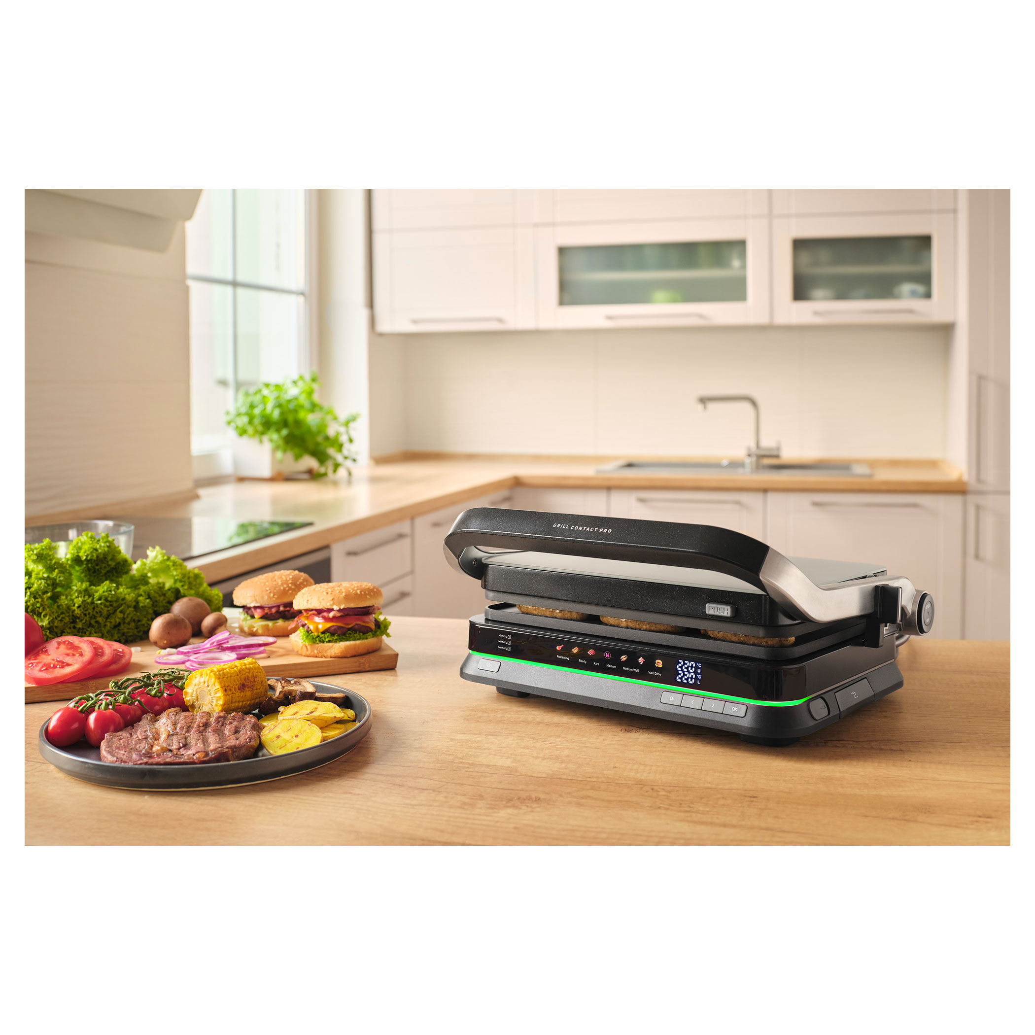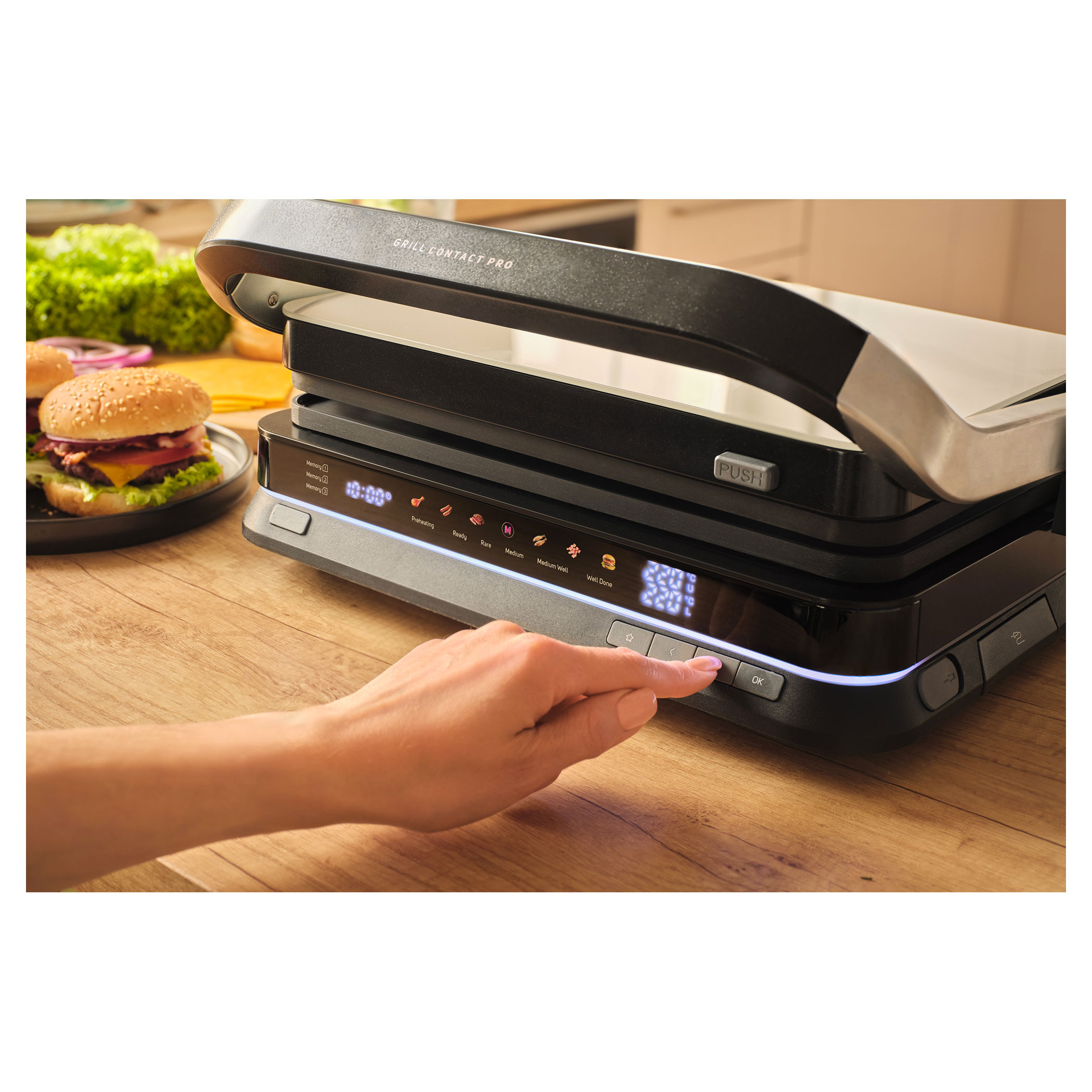 The Sencor SBG 7030BK contact grill allows easy preparation of juicy meat, burgers, fish, grilled vegetables and many other favourite dishes. Thanks to the intelligent sensor, it detects the thickness of the food and automatically adjusts the grilling time, while the doneness indicator clearly shows the current cooking level. The clear display ensures easy and intuitive operation. The grill also features 6 automatic programs, a temperature probe for precise cooking control and a maximum temperature of 250 °C. It can be used in three positions and the removable grill plates make cleaning very easy.