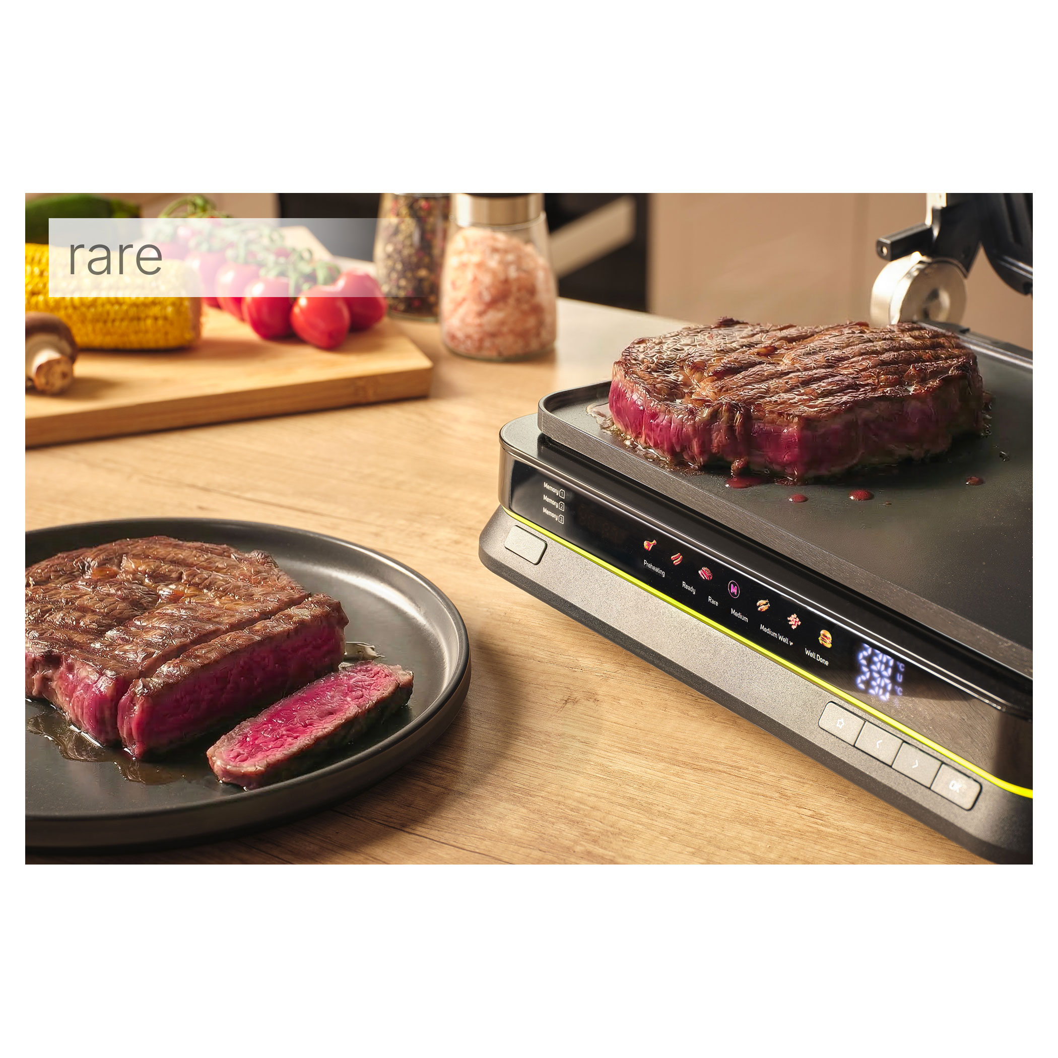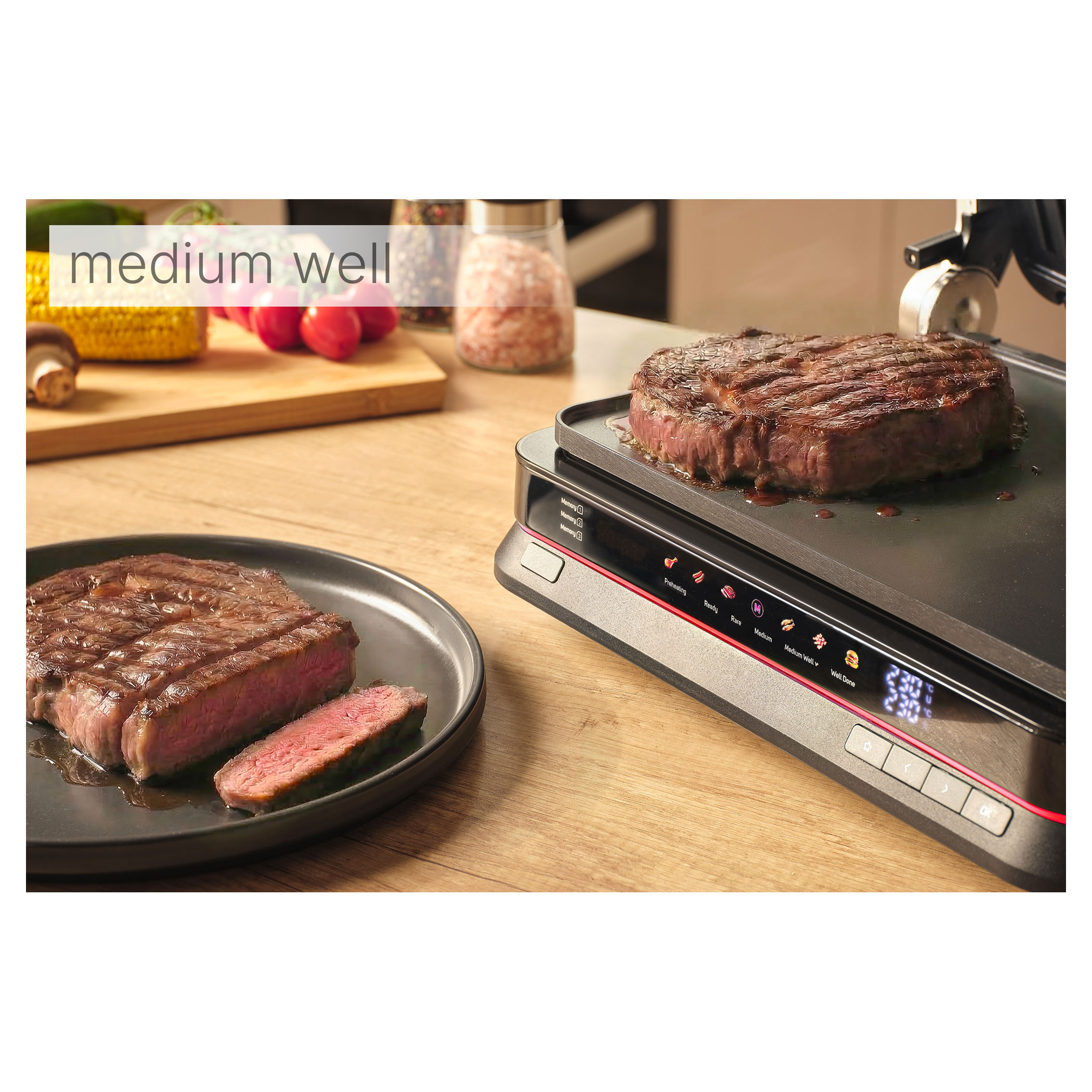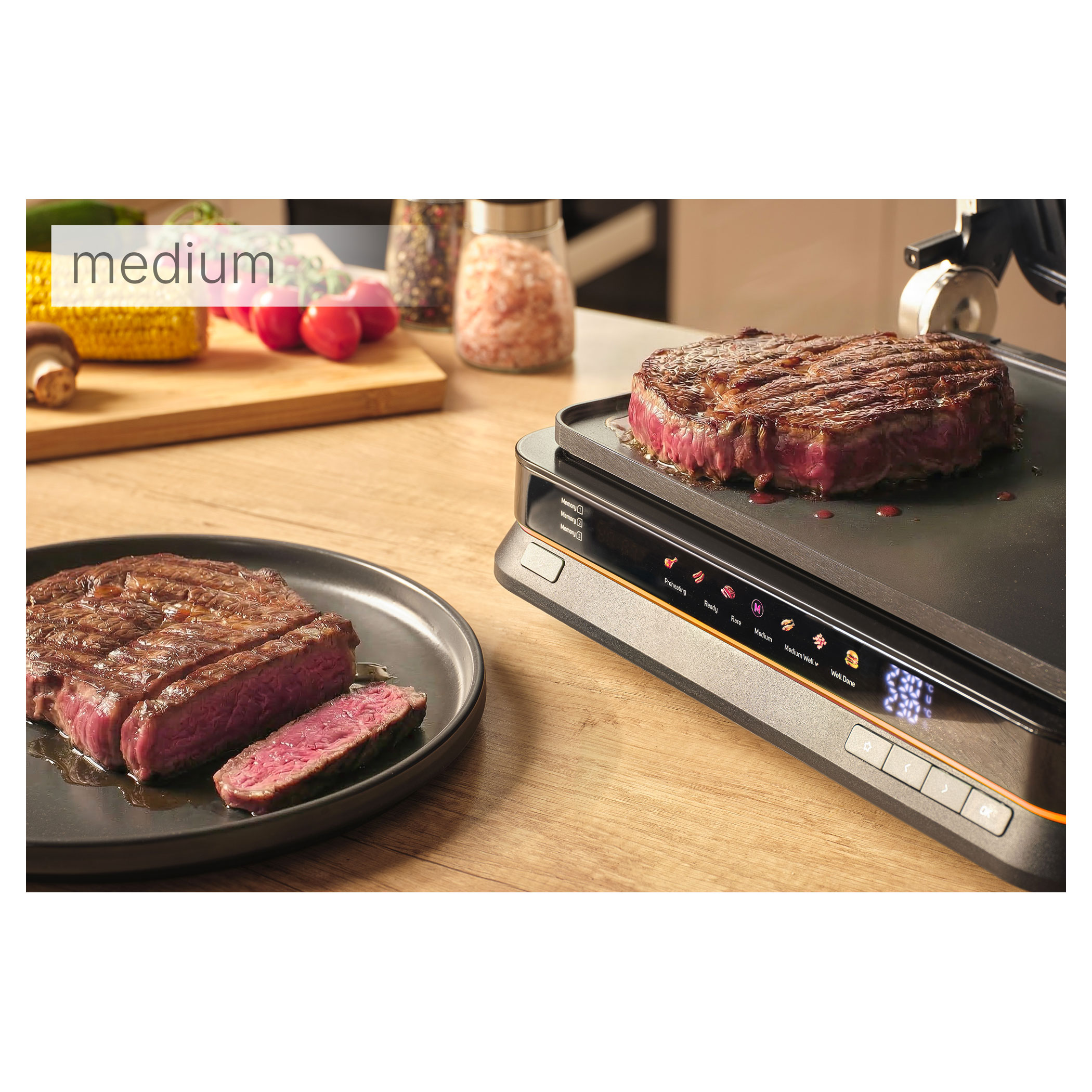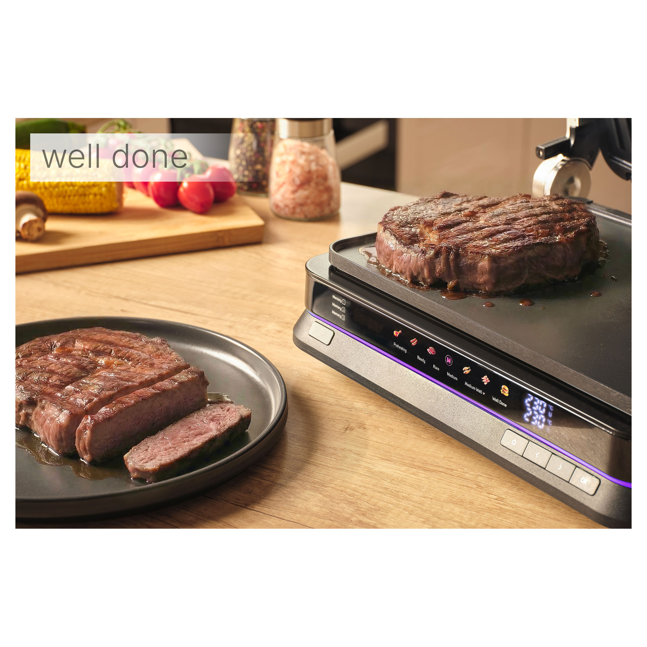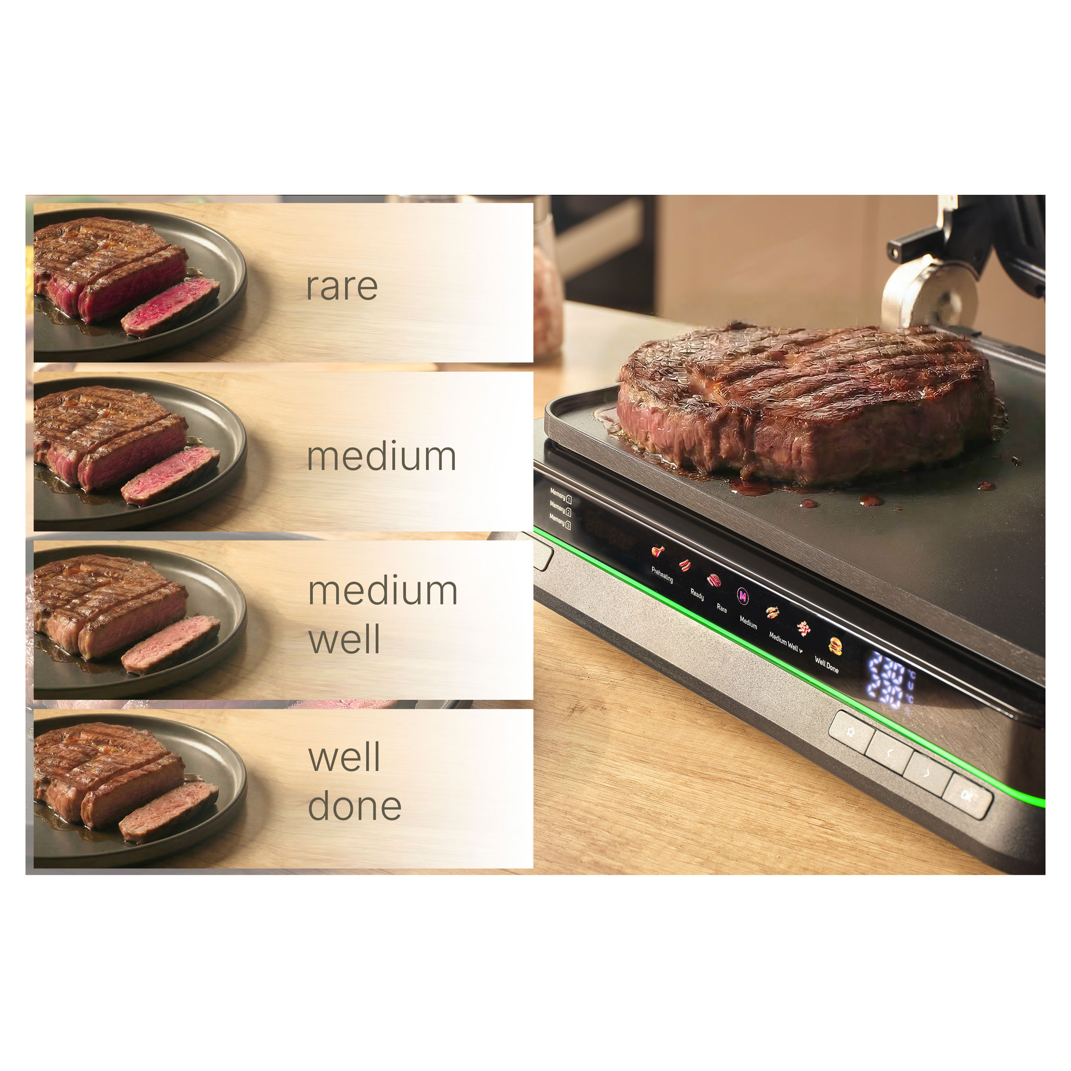 - doneness indicator (rare / medium / medium well / well done)