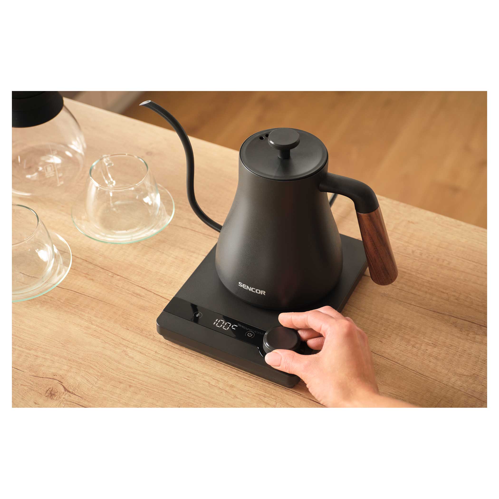 Brew like a barista with this premium 0.6L electric kettle, designed for tea and pour-over coffee lovers. Featuring a 1000W concealed heating element for fast boiling and a digital temperature control panel, it ensures precise brewing every time. The gooseneck spout offers gentle, controlled pouring—perfect for V60, Chemex, or drip methods. Crafted from durable SUS304 stainless steel with a real wood handle for comfort and balance, it includes boil-dry and overheat protection, auto shut-off, and a 2-hour keep warm function. The 360° STRIX connector guarantees safety and long-lasting performance. Compact, stylish, and built for precision—your perfect brewing companion.