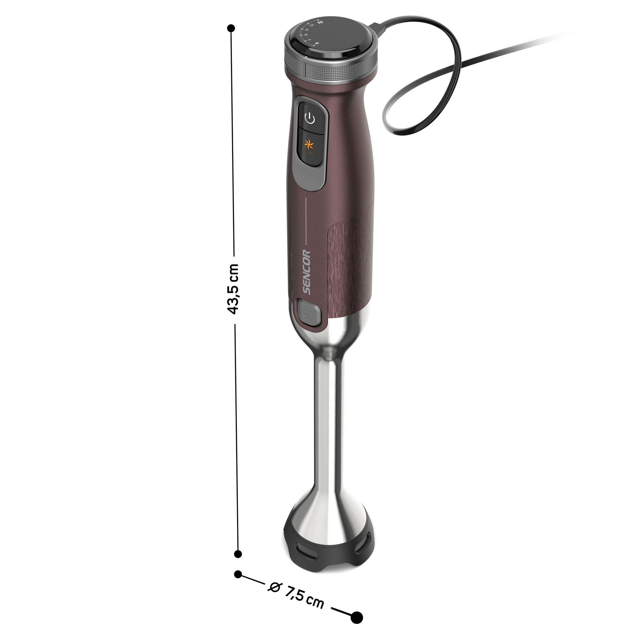 - Dimensions of the hand blender (W × D × H): 7.5 × 7.5 × 43.5 cm