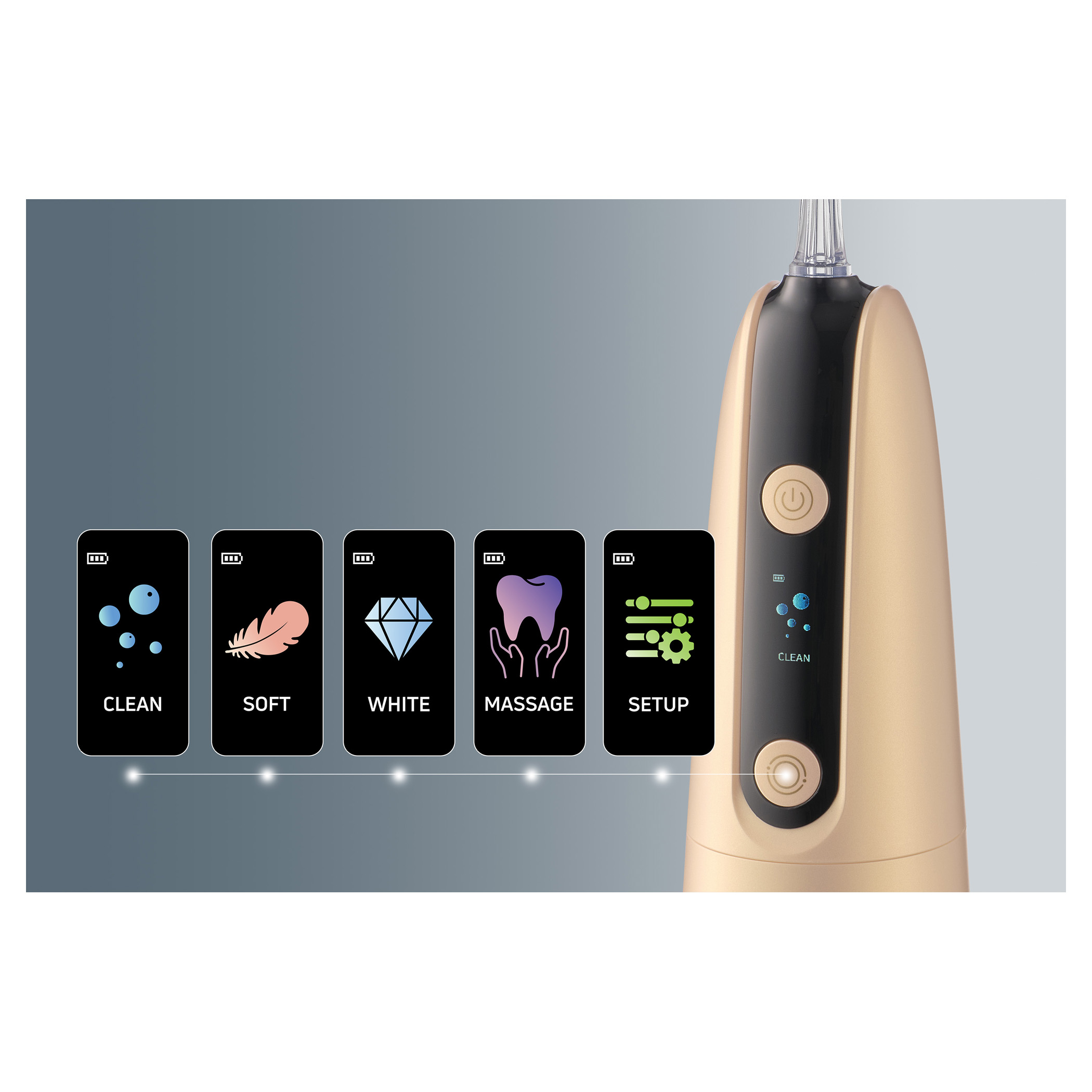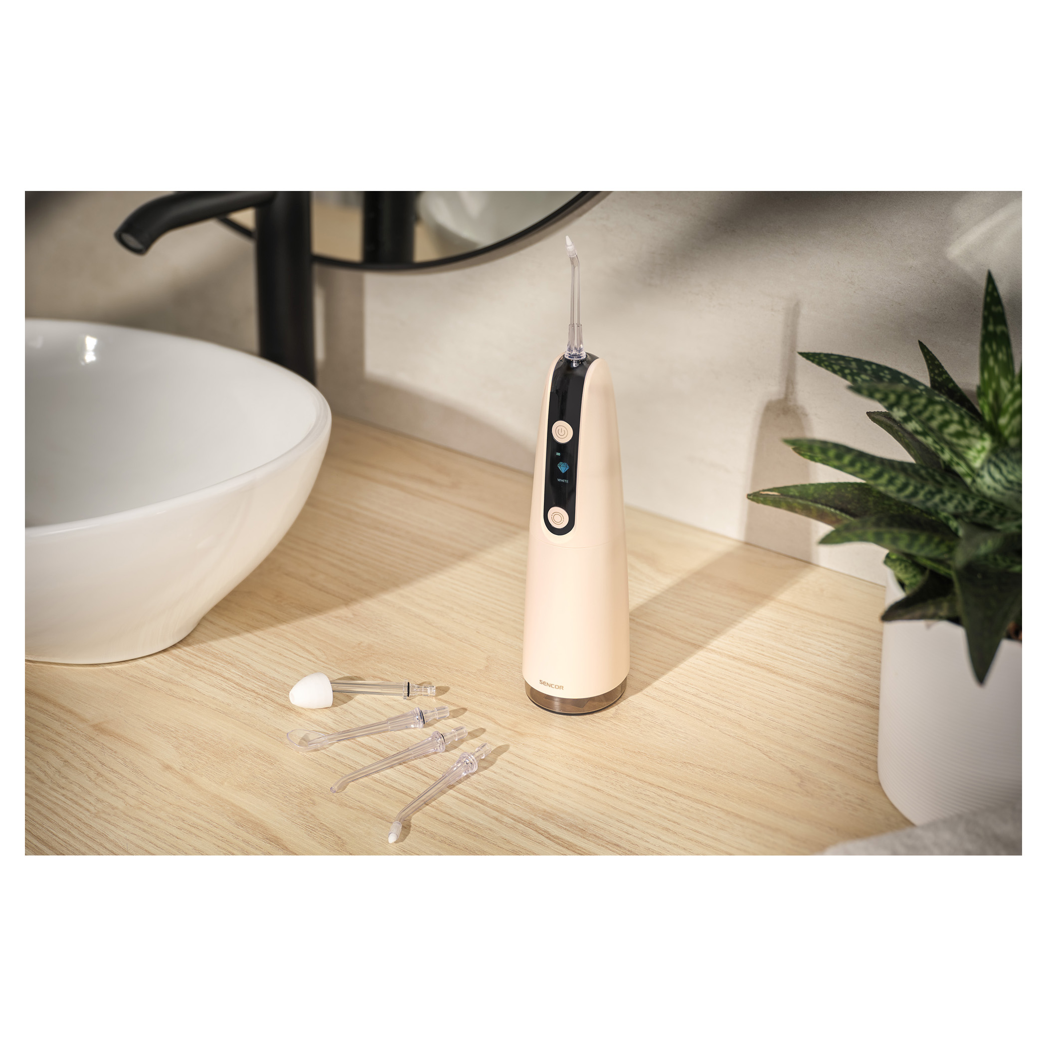 - 5 Jet Tips: Standard Nozzle, Pocket Tip, Orthodontic Tip, Tongue Scraper, Nasal Nozzle