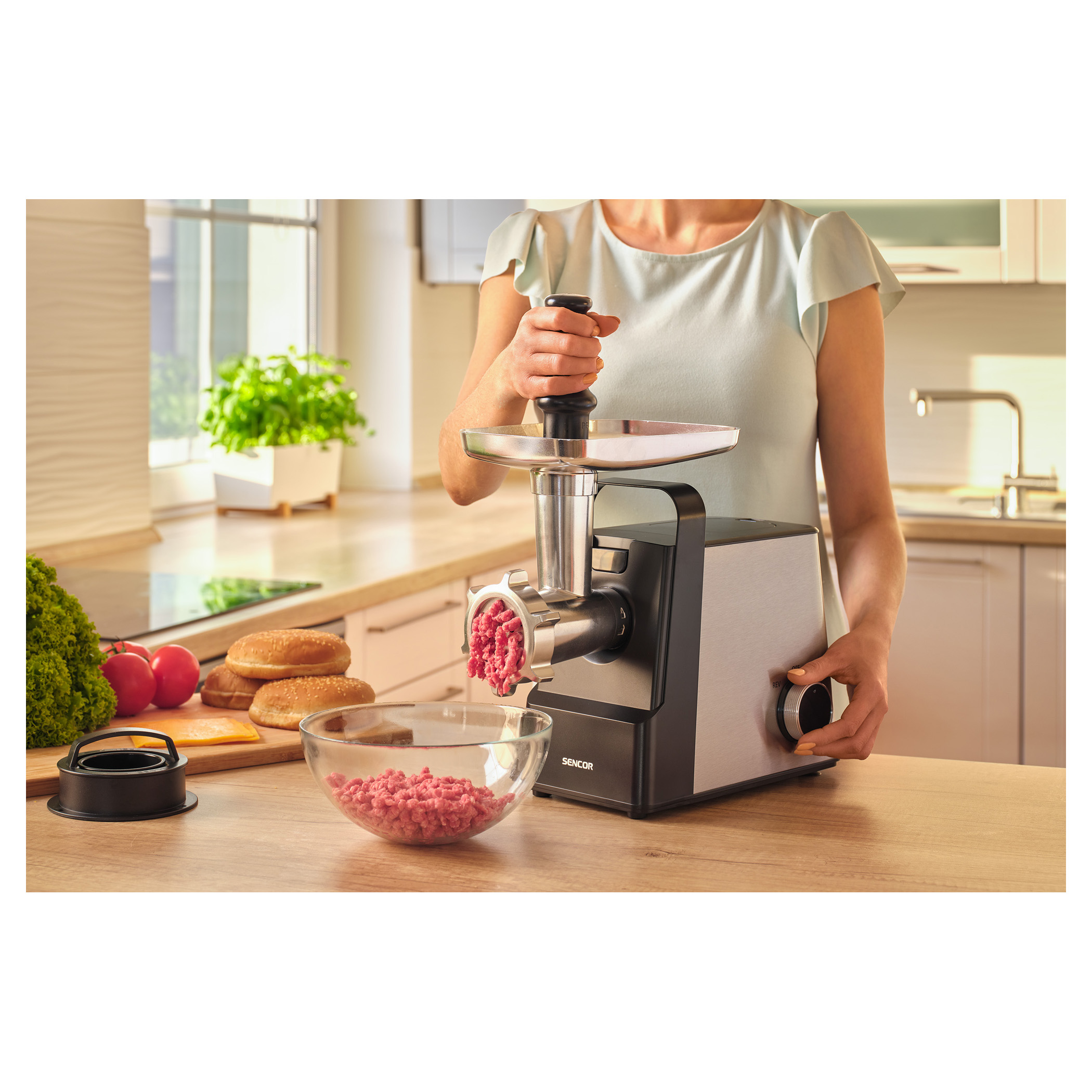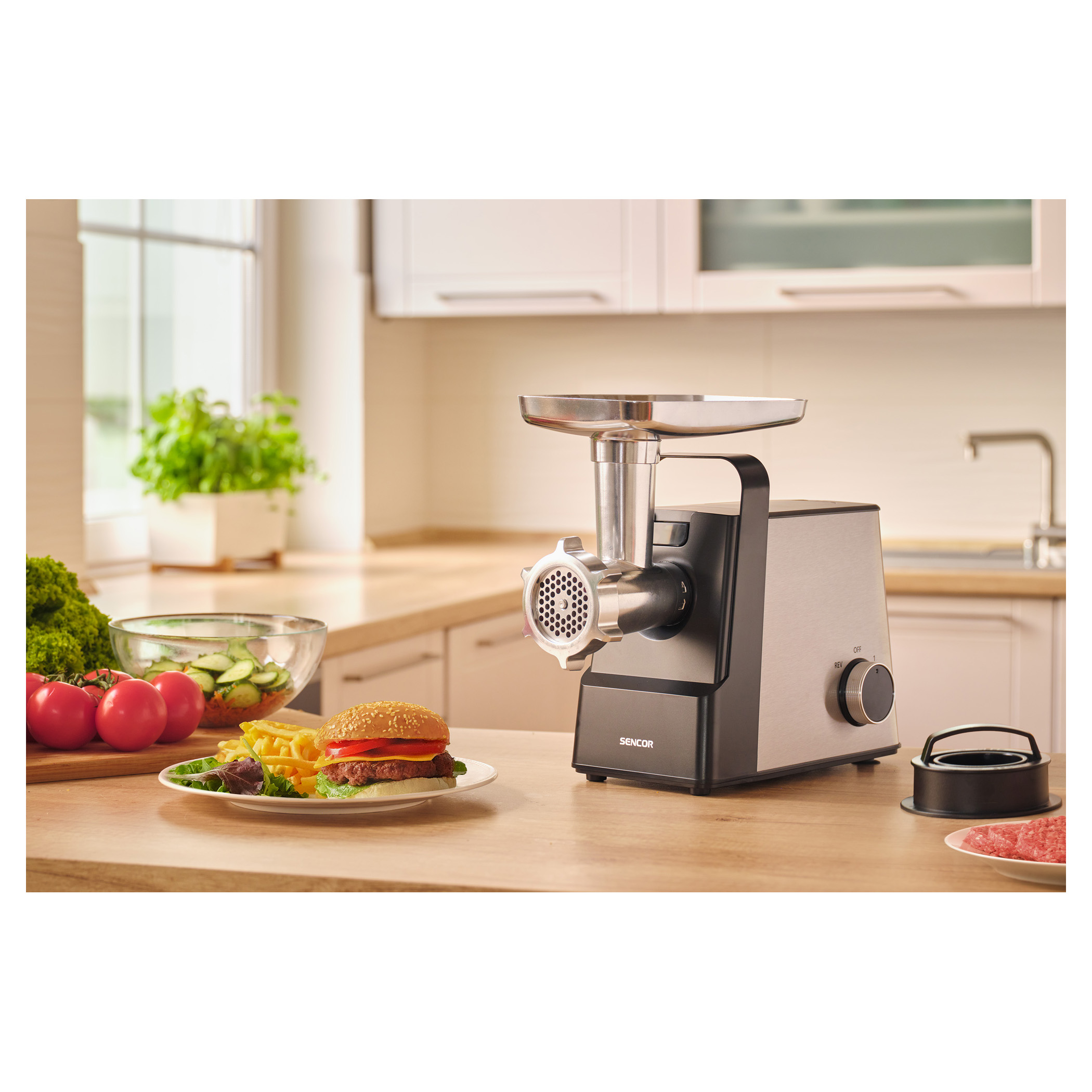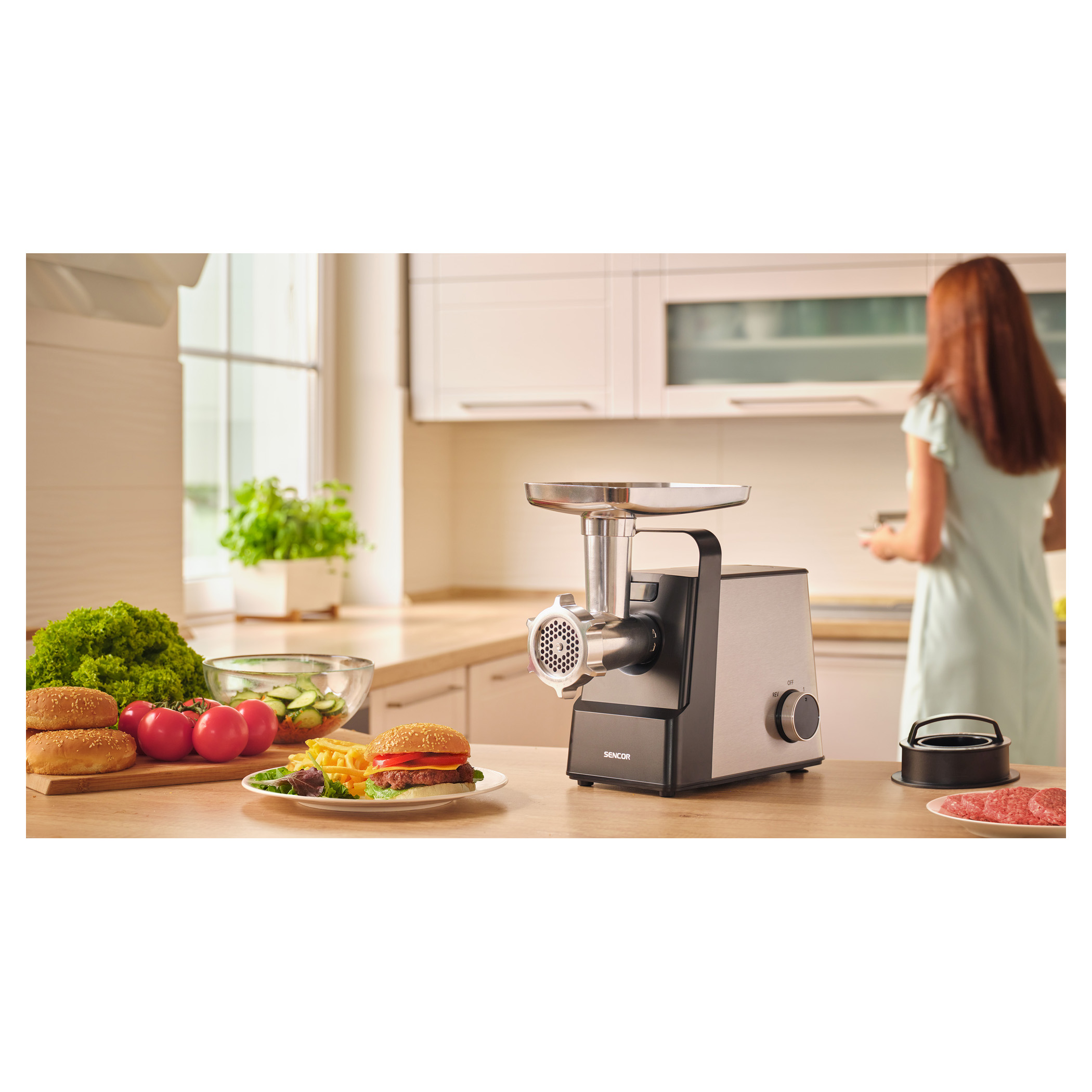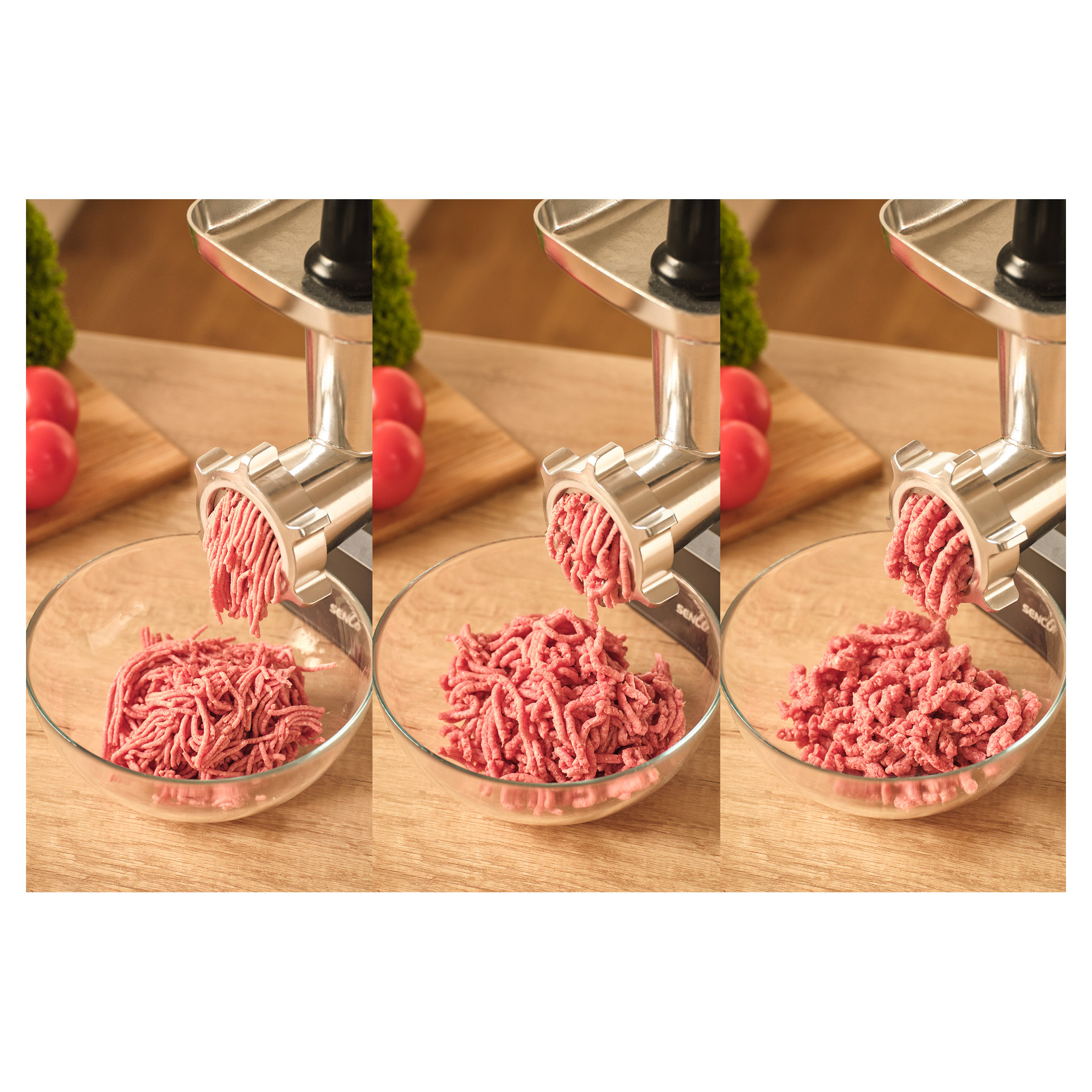 700 W motor/ Max power 2 100 W | Quick and easy mincing of various types of meat | Safety screw used to prevent motor overload | Capacity: 2.5 kg/min | 3 mincing disc - extra fine 3 mm/ fine 5 mm/ coarse 8 mm | Mincing blade and discs made from durable stainless steel | Aluminum filling pan | Food Pusher | Sausage & Kubbe attachment | Burger Press | Massive Slicer & Grater: Thin Slicing – Rough Slicing – Coarse shredding/ grating – Fine shredding/ grating - Grater for hard cheese and nuts | Cookie Maker | Anti-slip feet