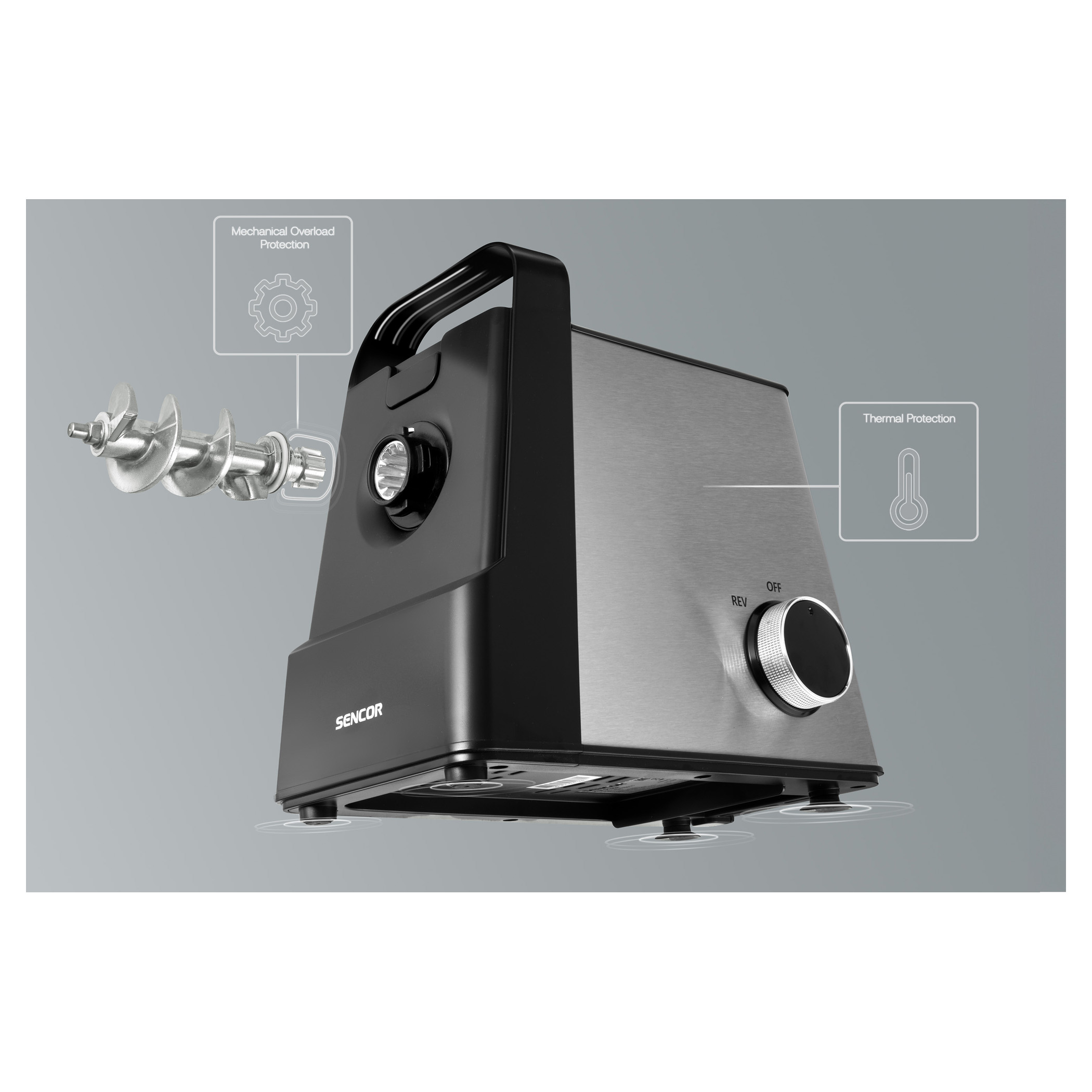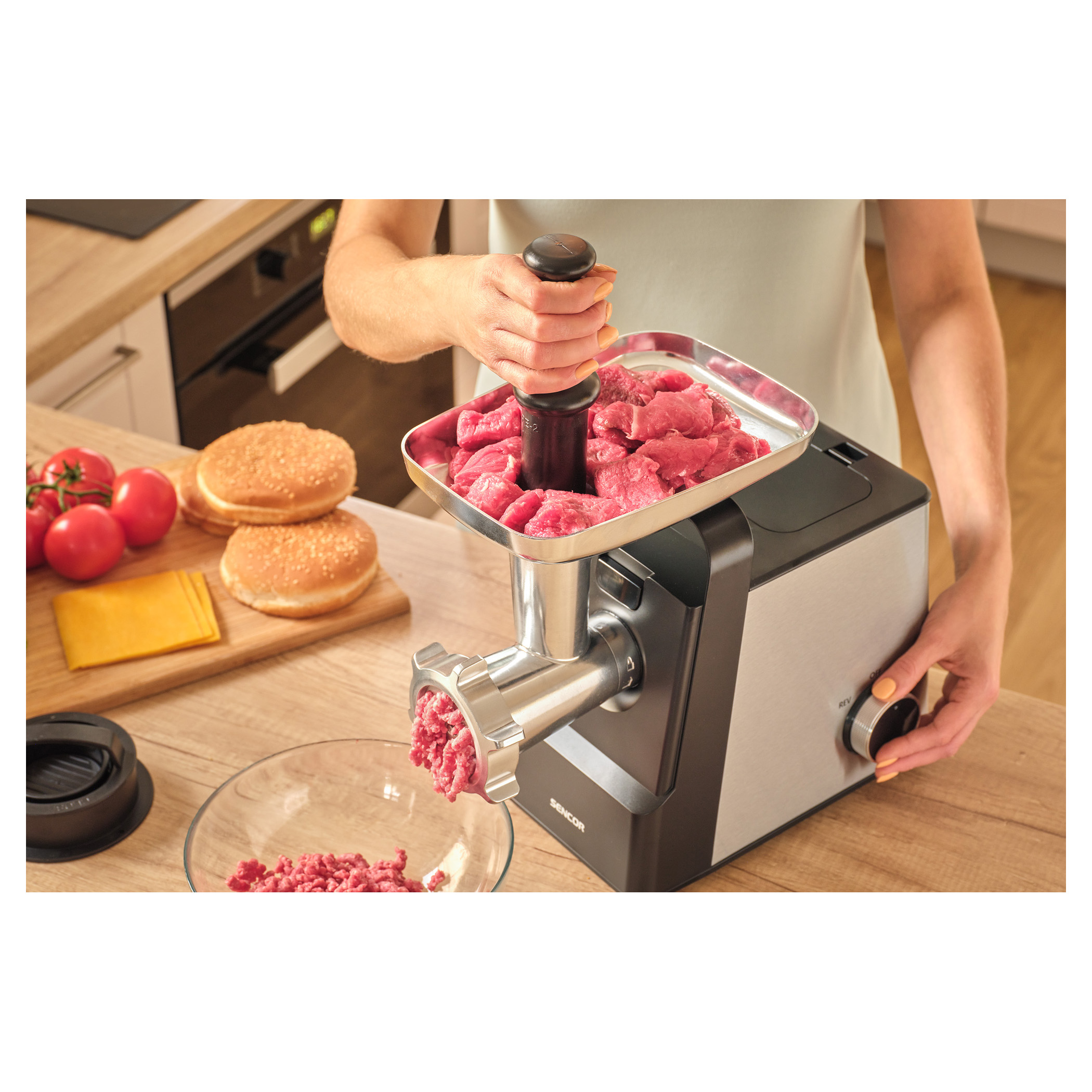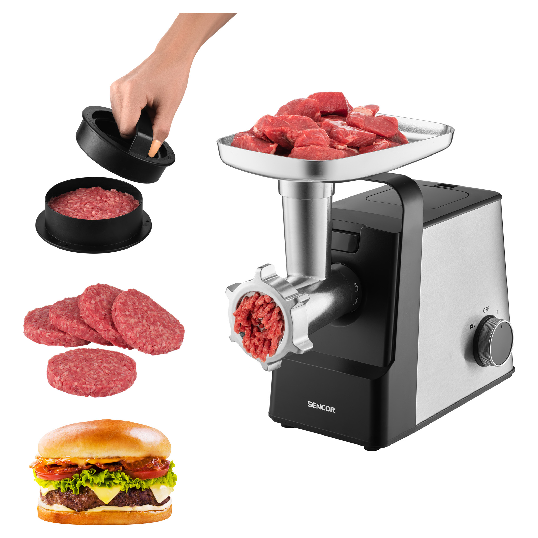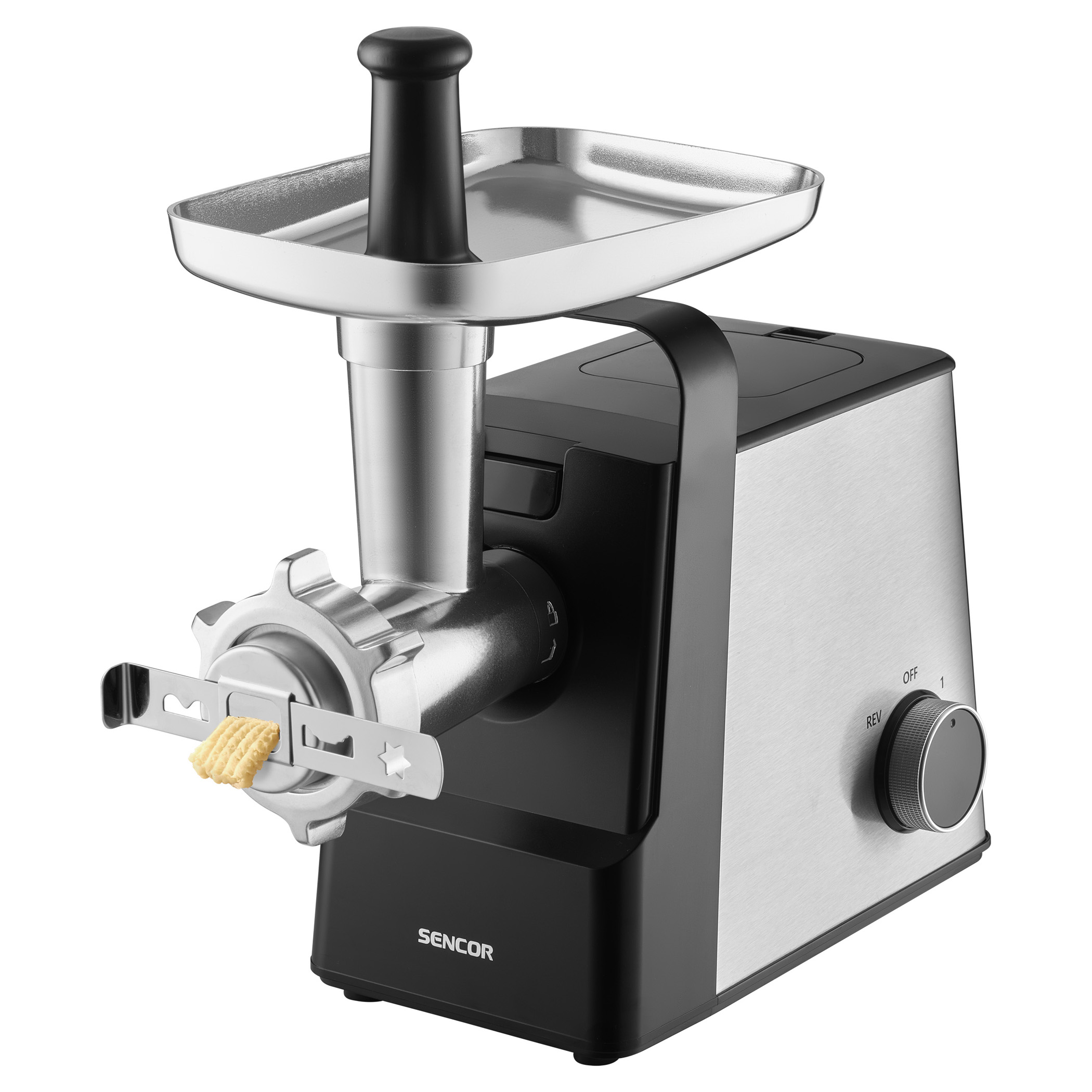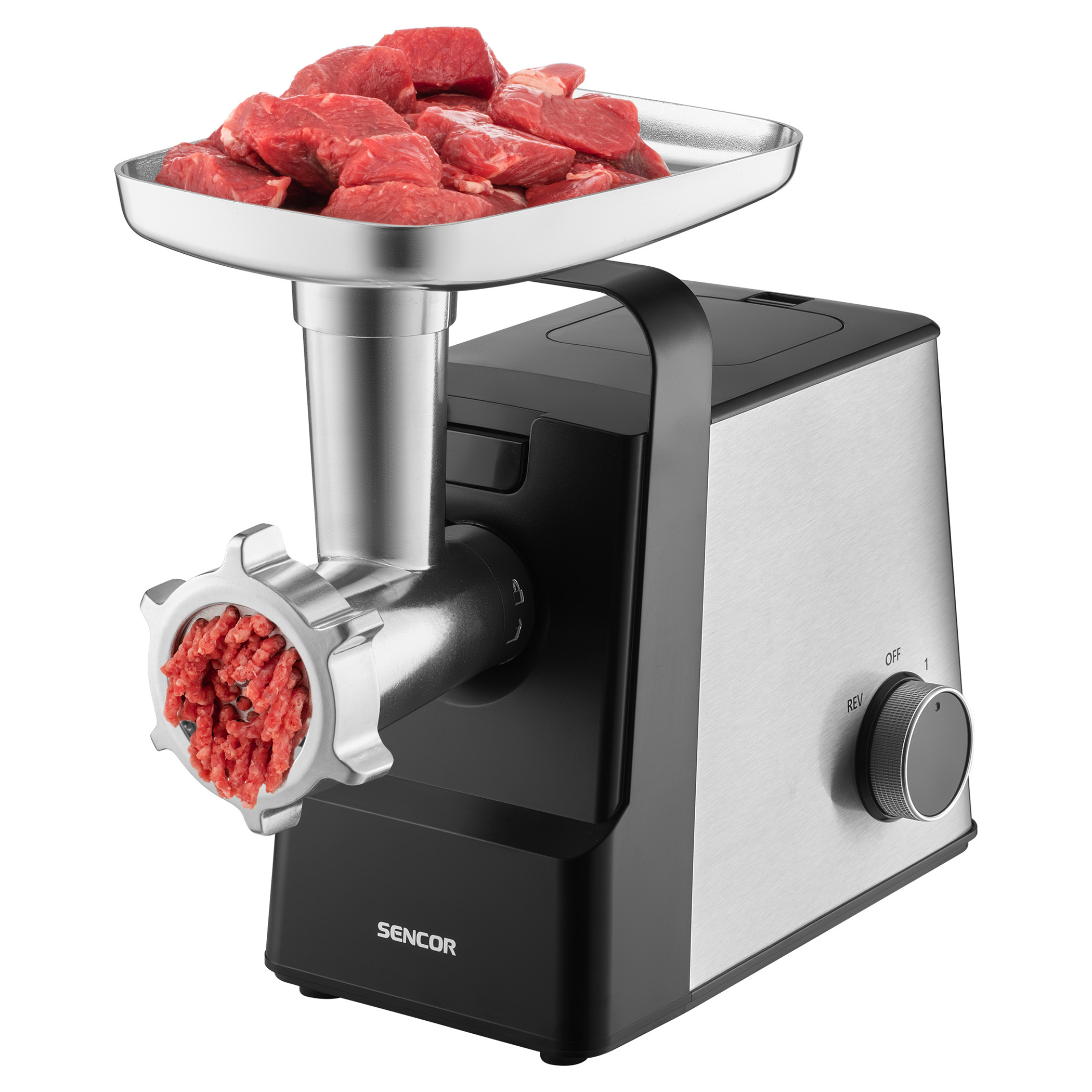 700 W motor/ Max power 2 100 W | Quick and easy mincing of various types of meat | Safety screw used to prevent motor overload | Capacity: 2.5 kg/min | 3 mincing disc - extra fine 3 mm/ fine 5 mm/ coarse 8 mm | Mincing blade and discs made from durable stainless steel | Aluminum filling pan | Food Pusher | Sausage & Kubbe attachment | Burger Press | Massive Slicer & Grater: Thin Slicing – Rough Slicing – Coarse shredding/ grating – Fine shredding/ grating - Grater for hard cheese and nuts | Cookie Maker | Anti-slip feet