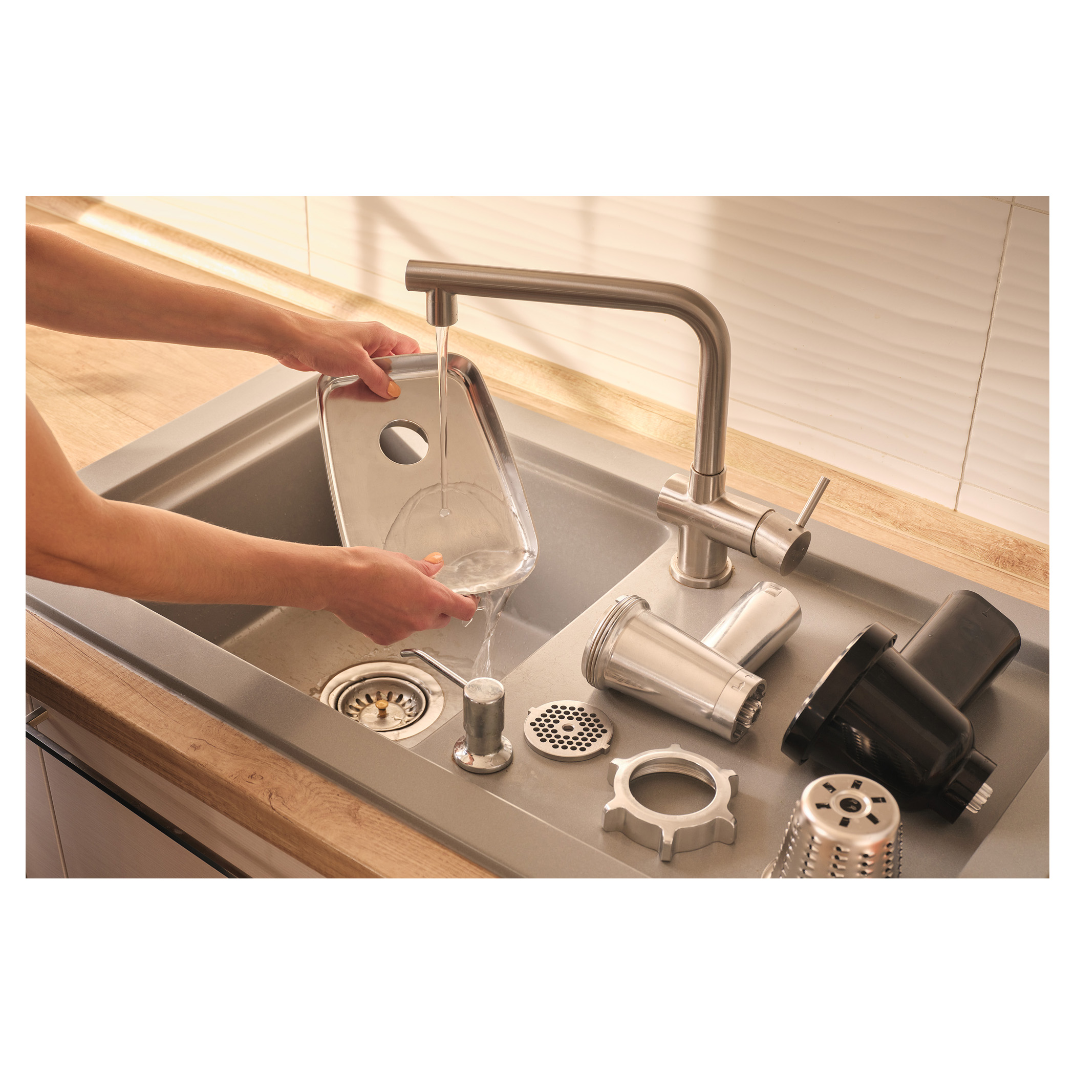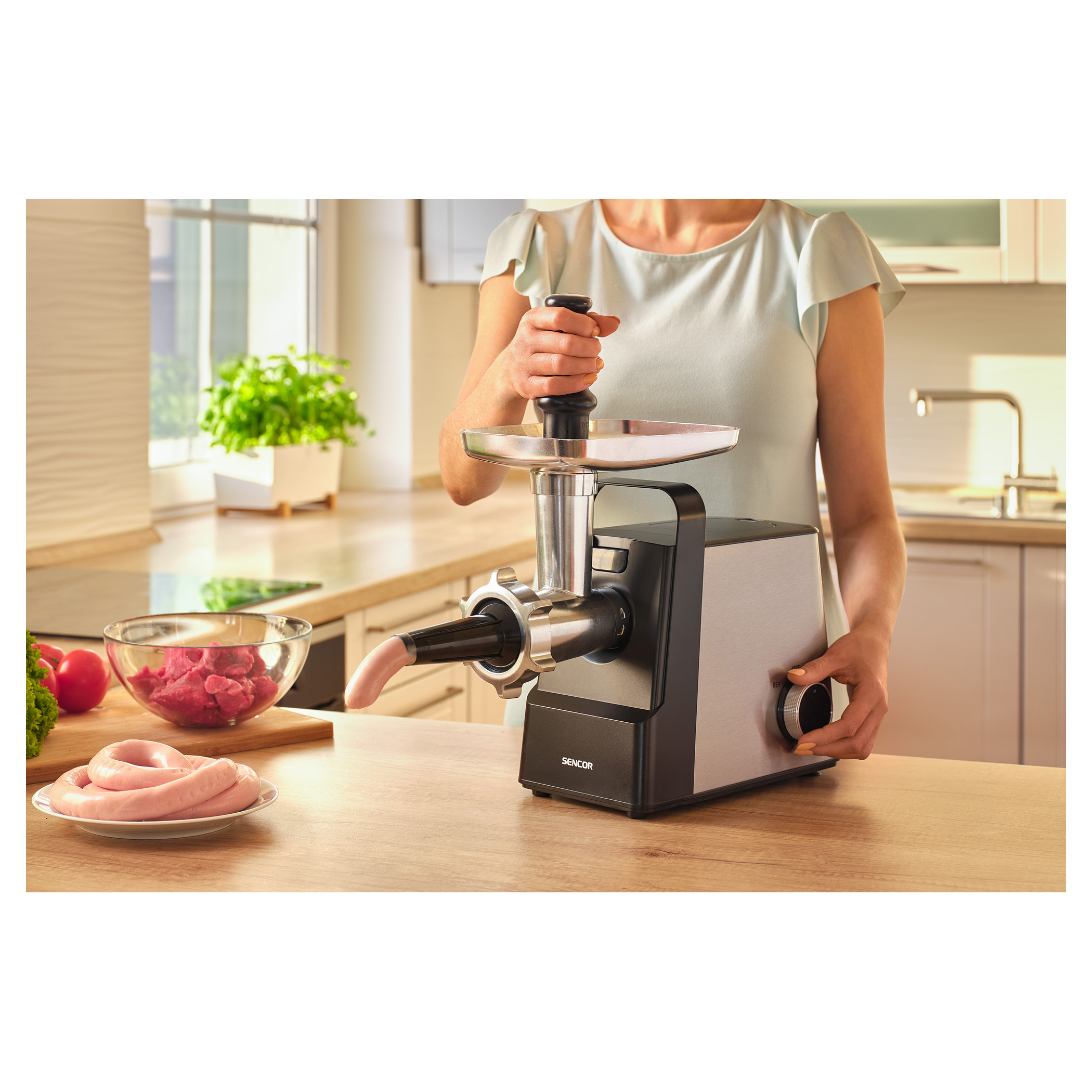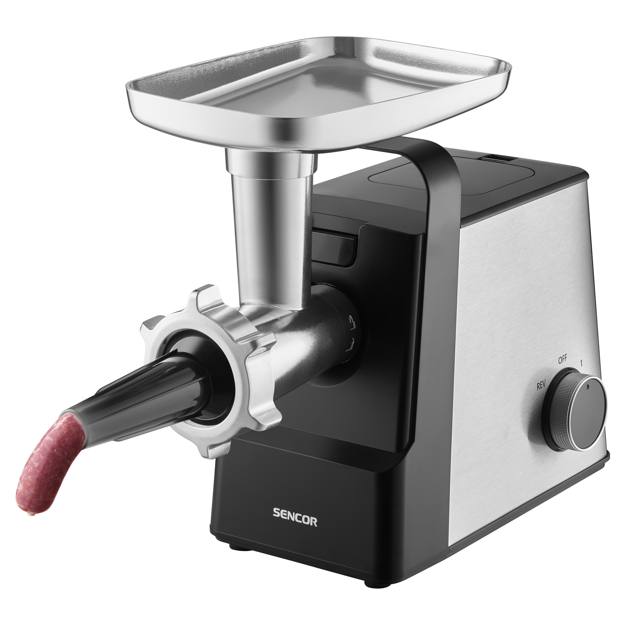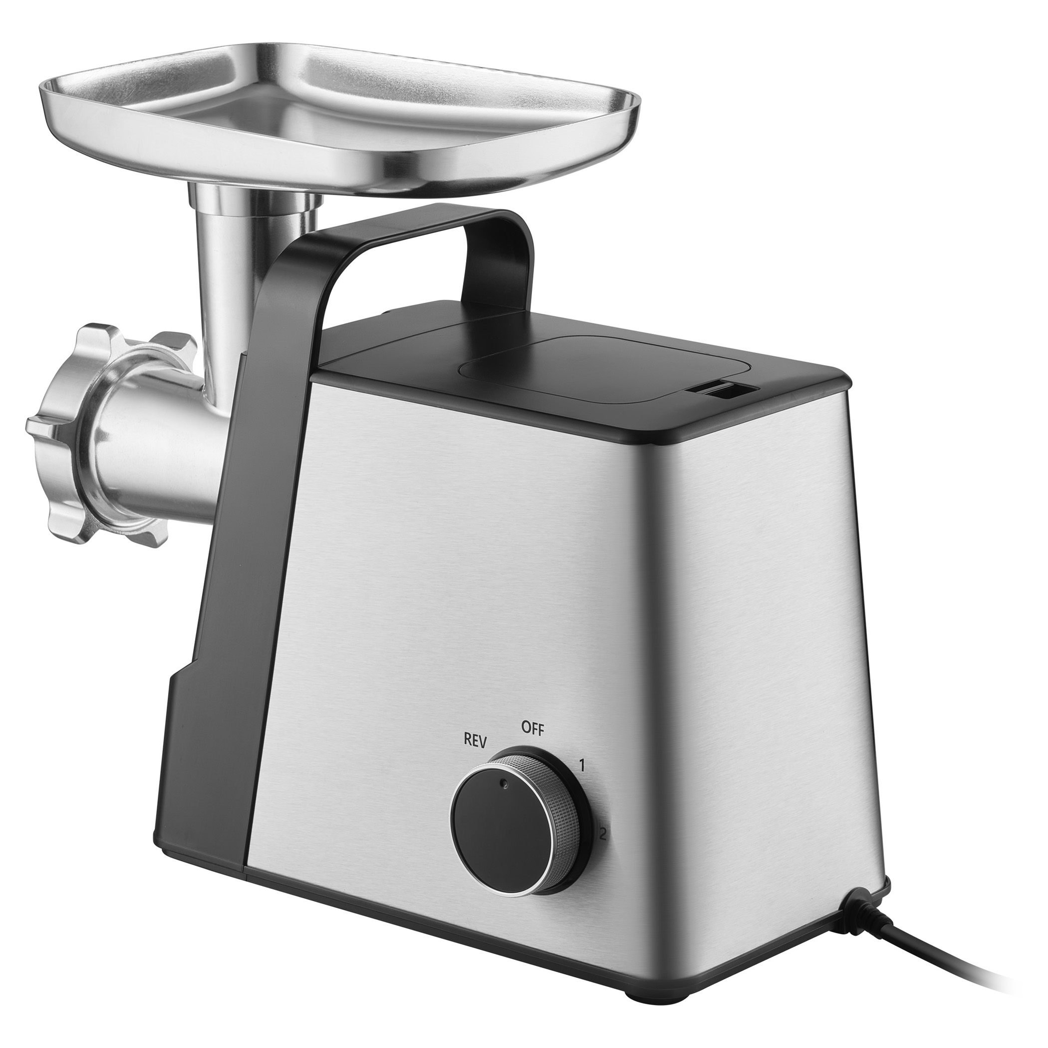 700 W motor/ Max power 2 100 W | Quick and easy mincing of various types of meat | Safety screw used to prevent motor overload | Capacity: 2.5 kg/min | 3 mincing disc - extra fine 3 mm/ fine 5 mm/ coarse 8 mm | Mincing blade and discs made from durable stainless steel | Aluminum filling pan | Food Pusher | Sausage & Kubbe attachment | Burger Press | Massive Slicer & Grater: Thin Slicing – Rough Slicing – Coarse shredding/ grating – Fine shredding/ grating - Grater for hard cheese and nuts | Cookie Maker | Anti-slip feet