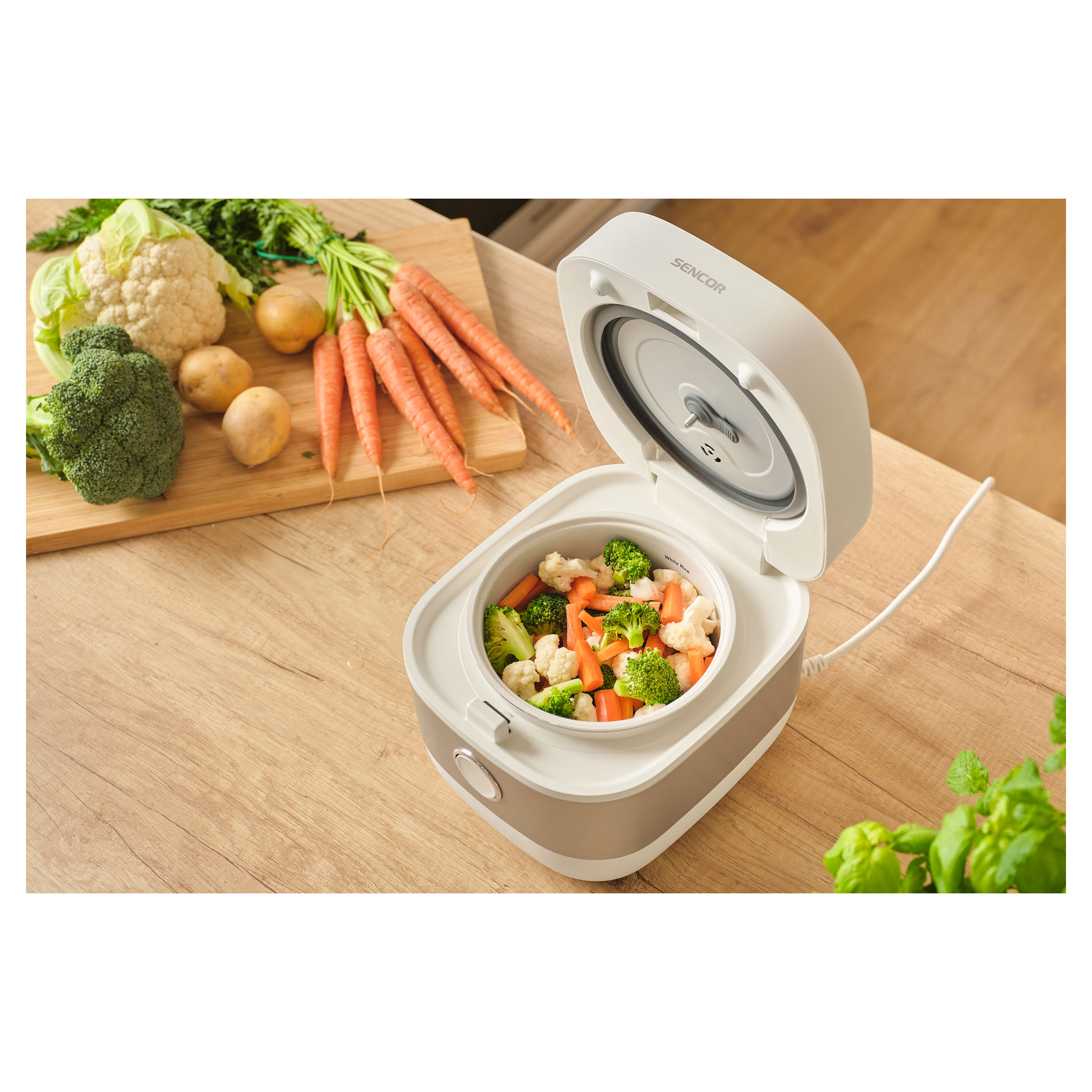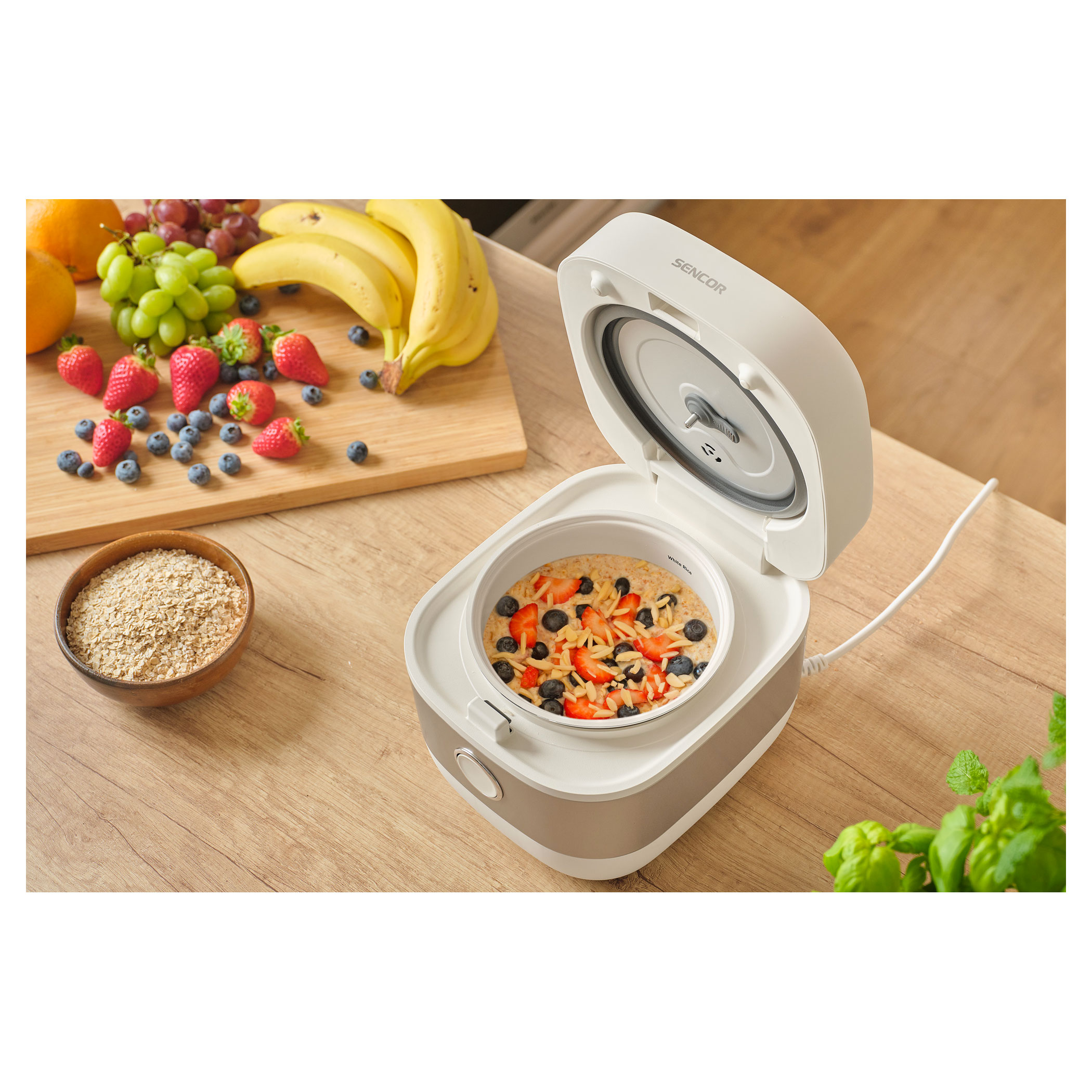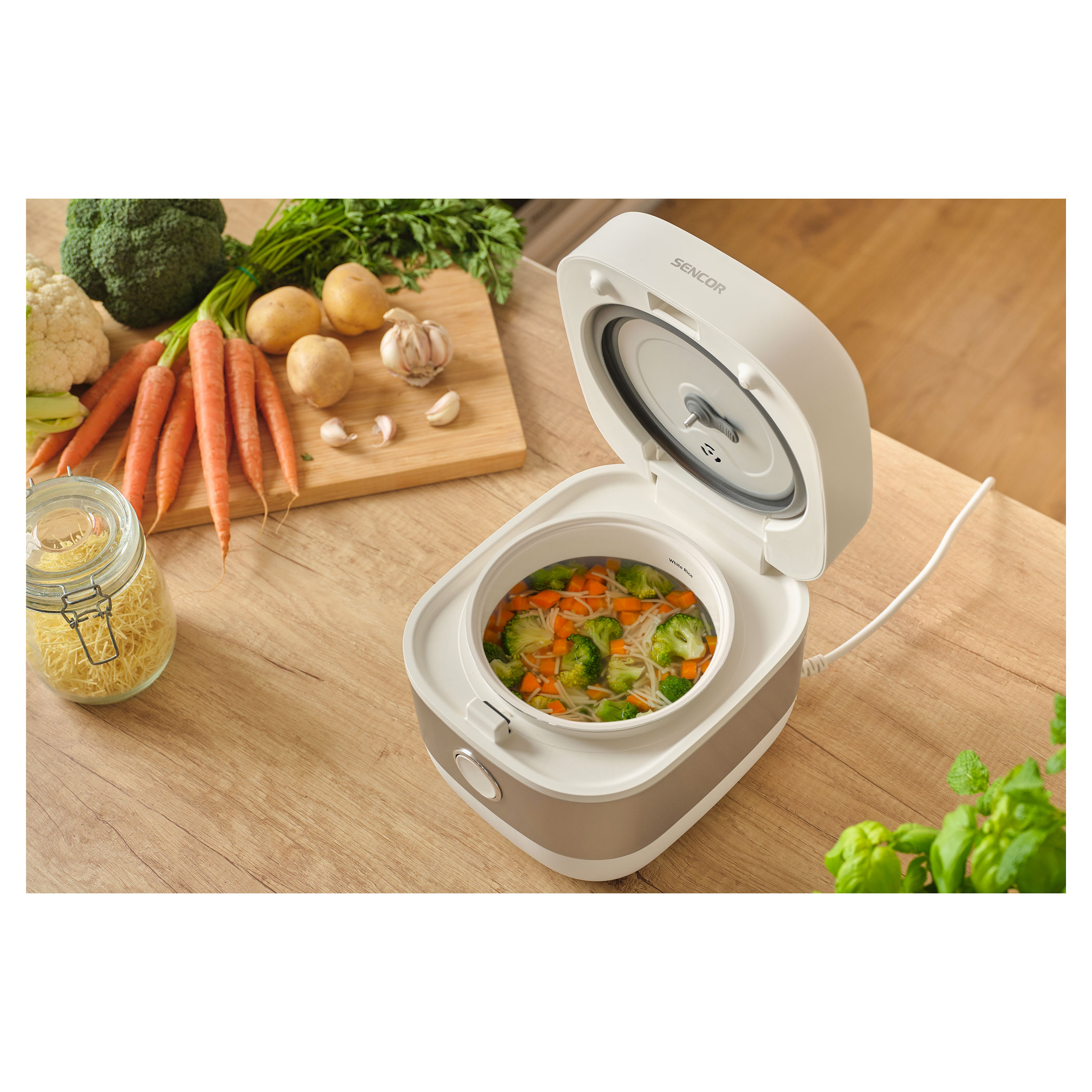 The Sencor SRM 1600WH rice cooker is designed for convenient everyday preparation of rice, porridge, soups, and other dishes. The aluminum inner pot with a ceramic coating and a 1.6 l capacity is ideal for regular home cooking. A clear digital display and 6 preset programs ensure simple and intuitive operation.