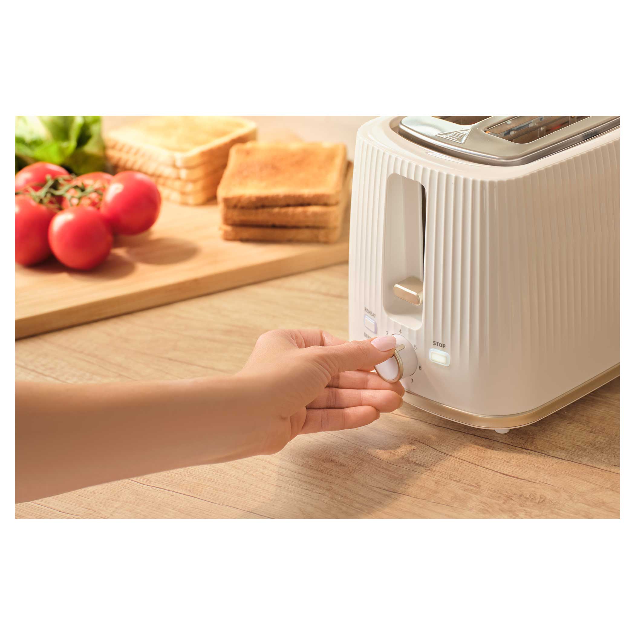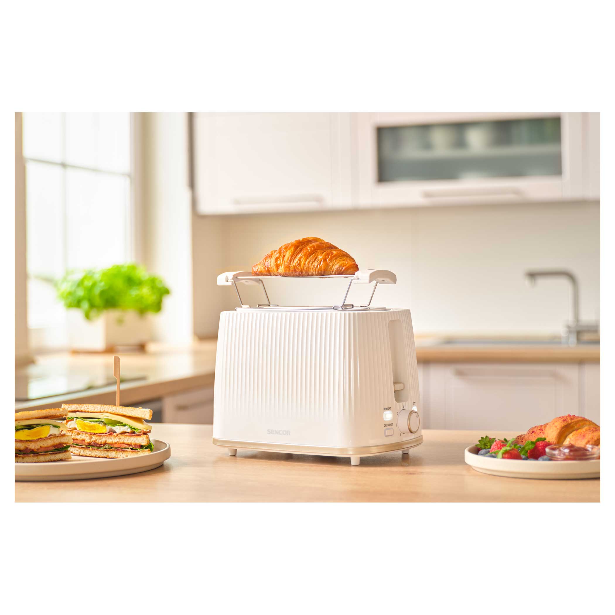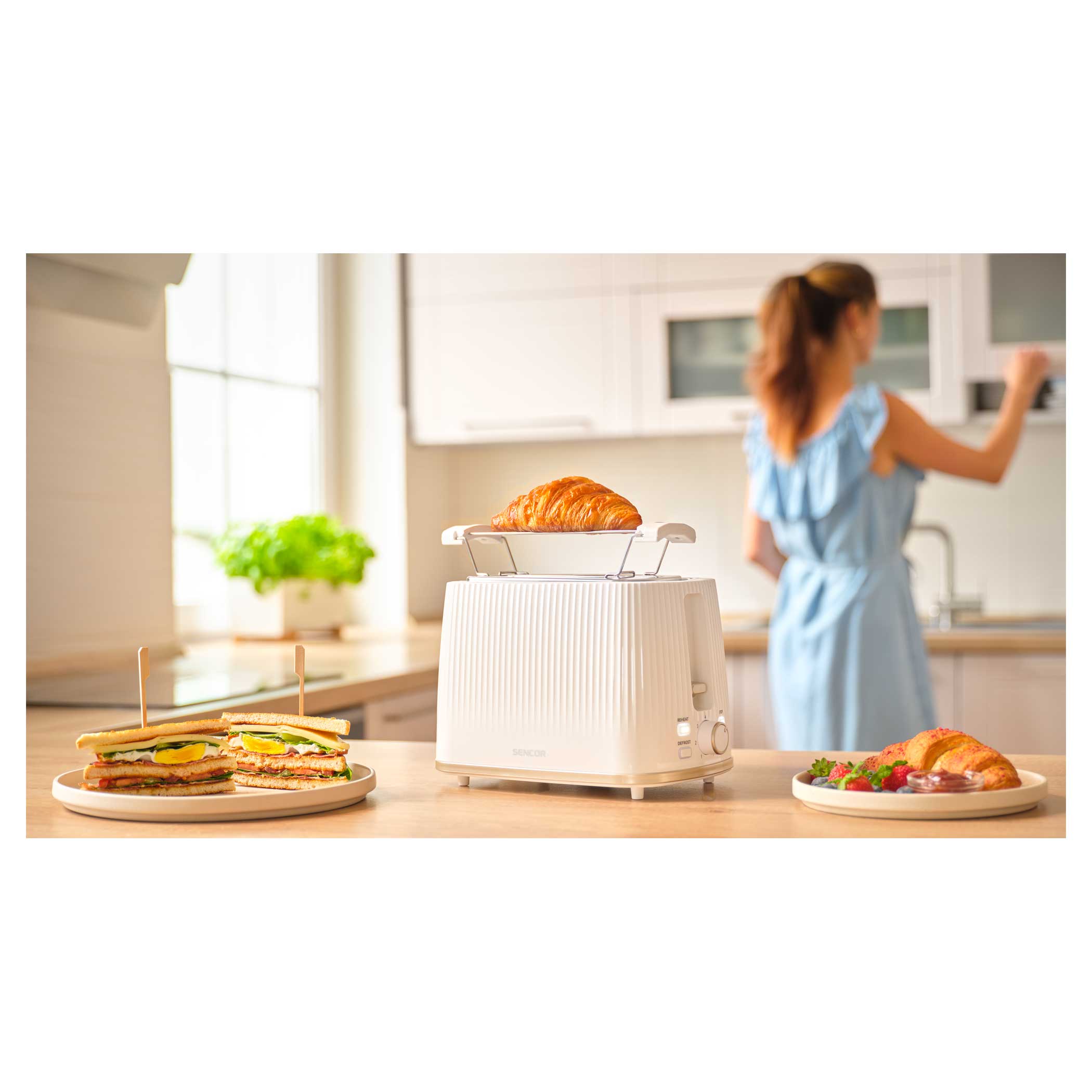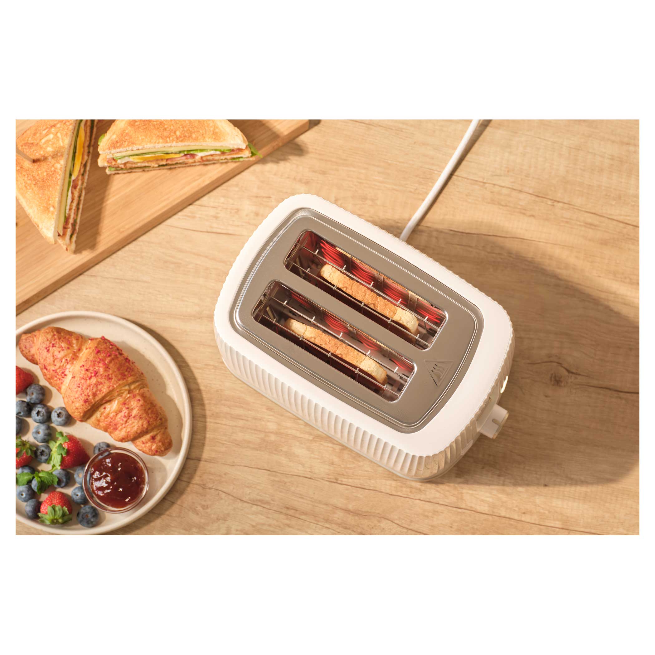 With the toaster with 2 toasting slots and 7 toasting intensity levels, you can easily prepare toasts the way you like them. Thanks to several functions, it heats, toasts and defrosts pastries. It also prepares buns or baguettes with the help of the toasting grid. For a quick interruption of operation, it has an instant stop toasting function.• 2 toasting slots