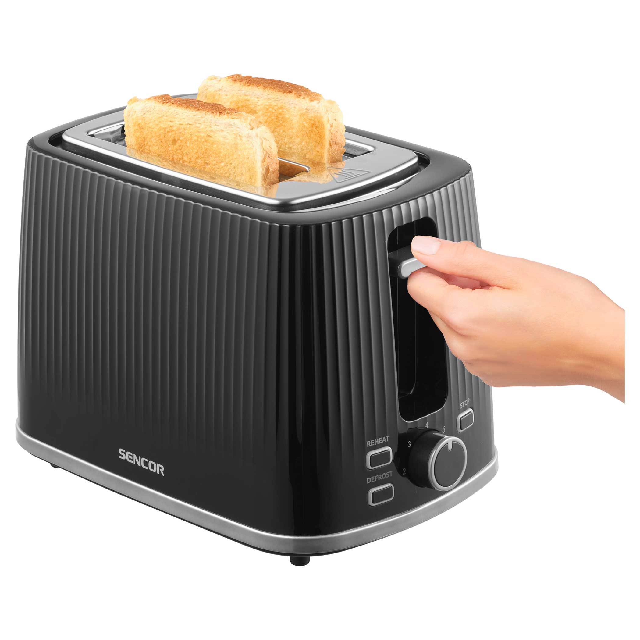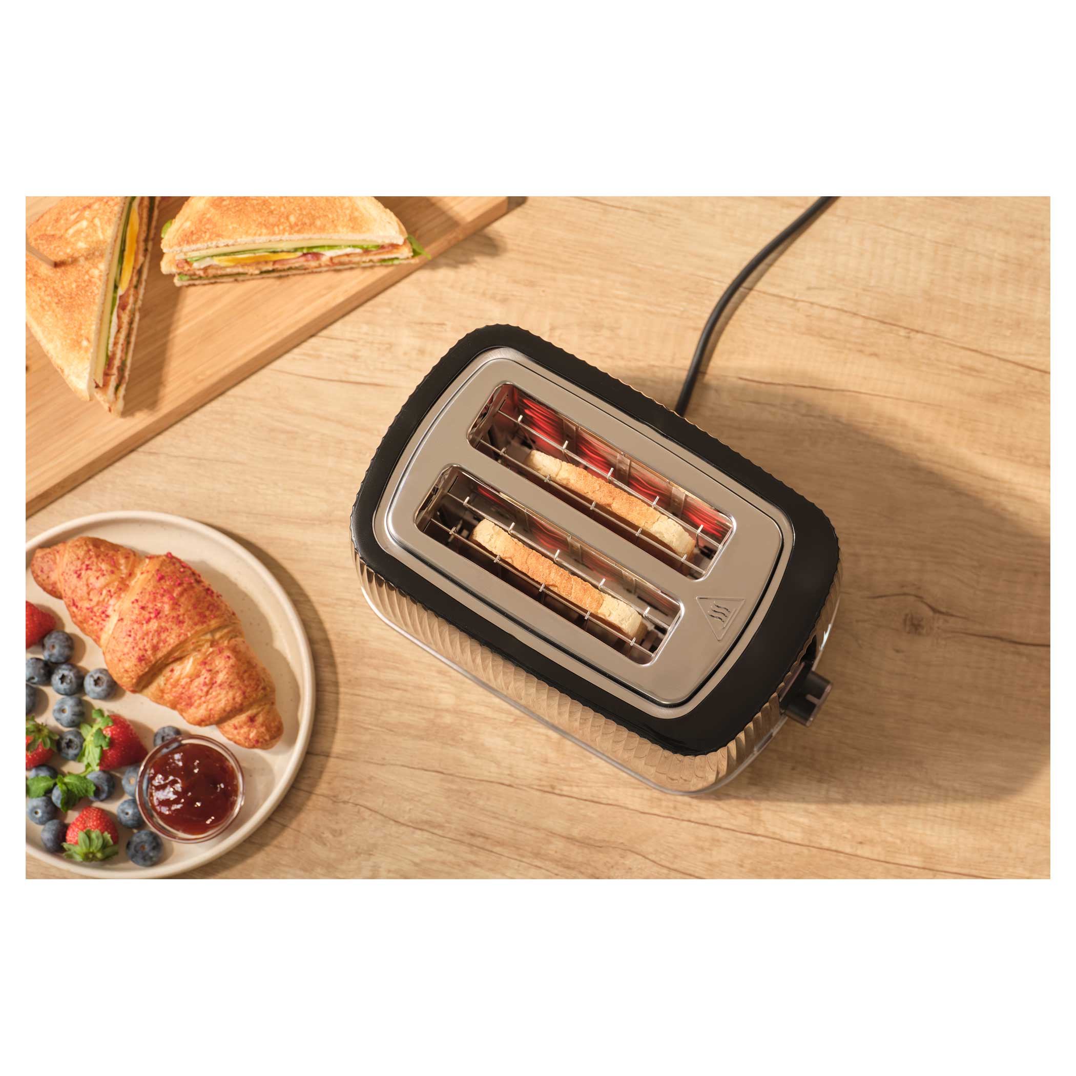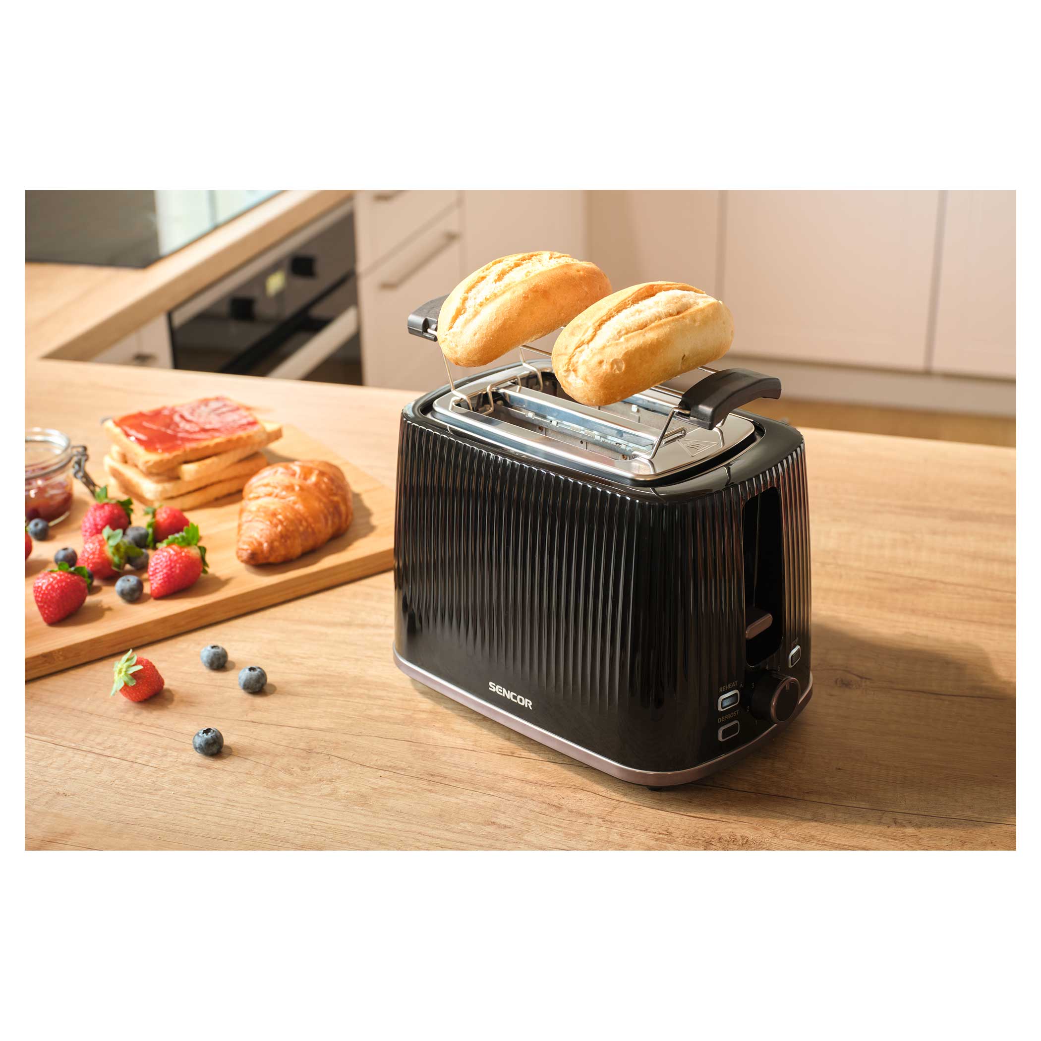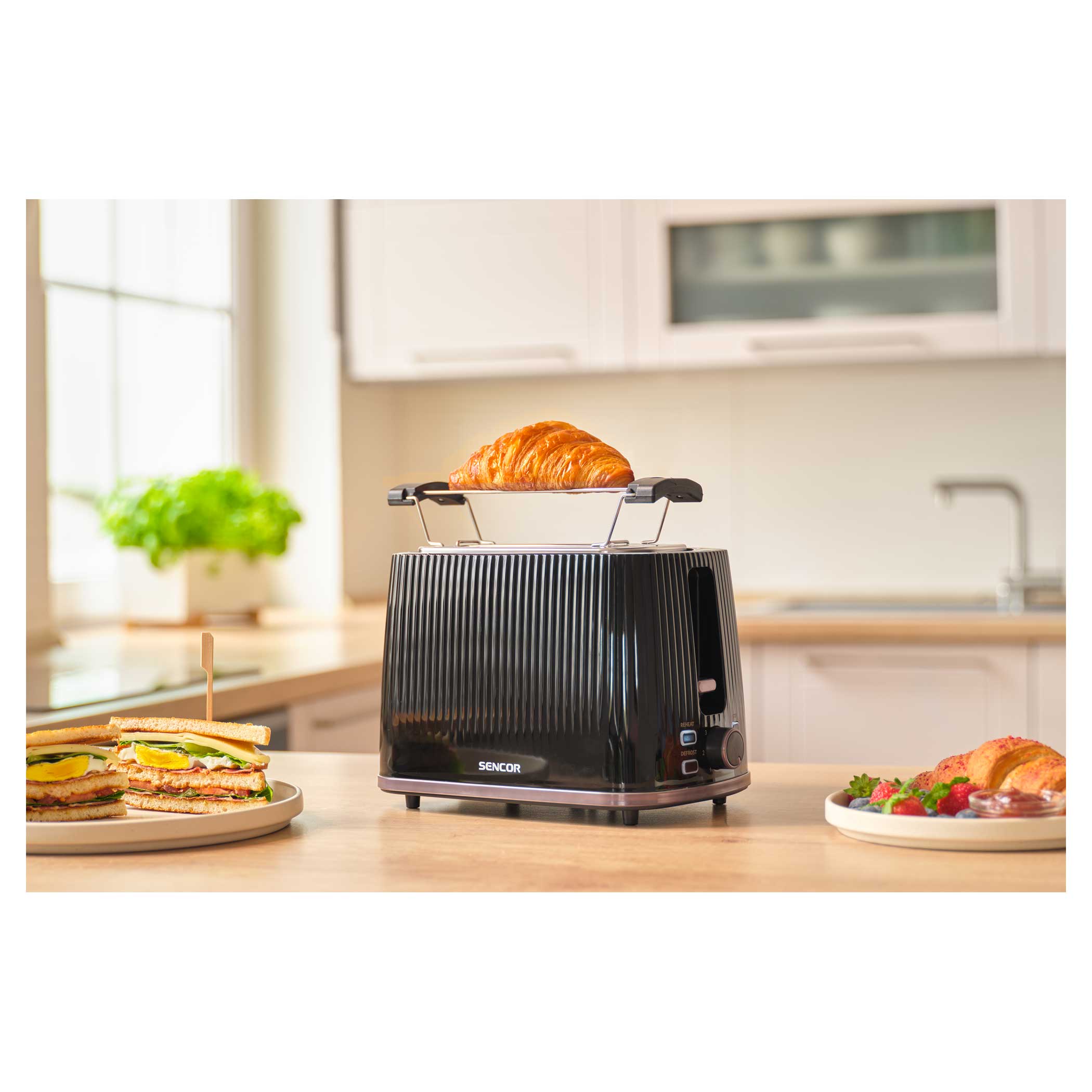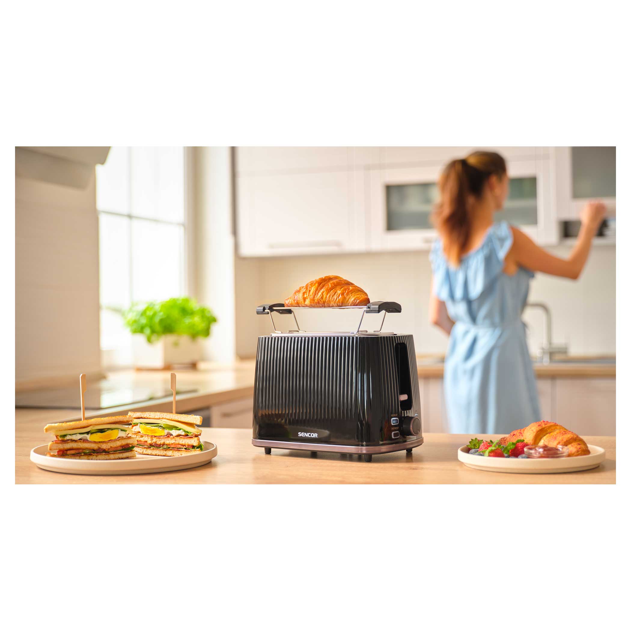 With the toaster with 2 toasting slots and 7 toasting intensity levels, you can easily prepare toasts the way you like them. Thanks to several functions, it heats, toasts and defrosts pastries. It also prepares buns or baguettes with the help of the toasting grid. For a quick interruption of operation, it has an instant stop toasting function.- 2 toasting slots