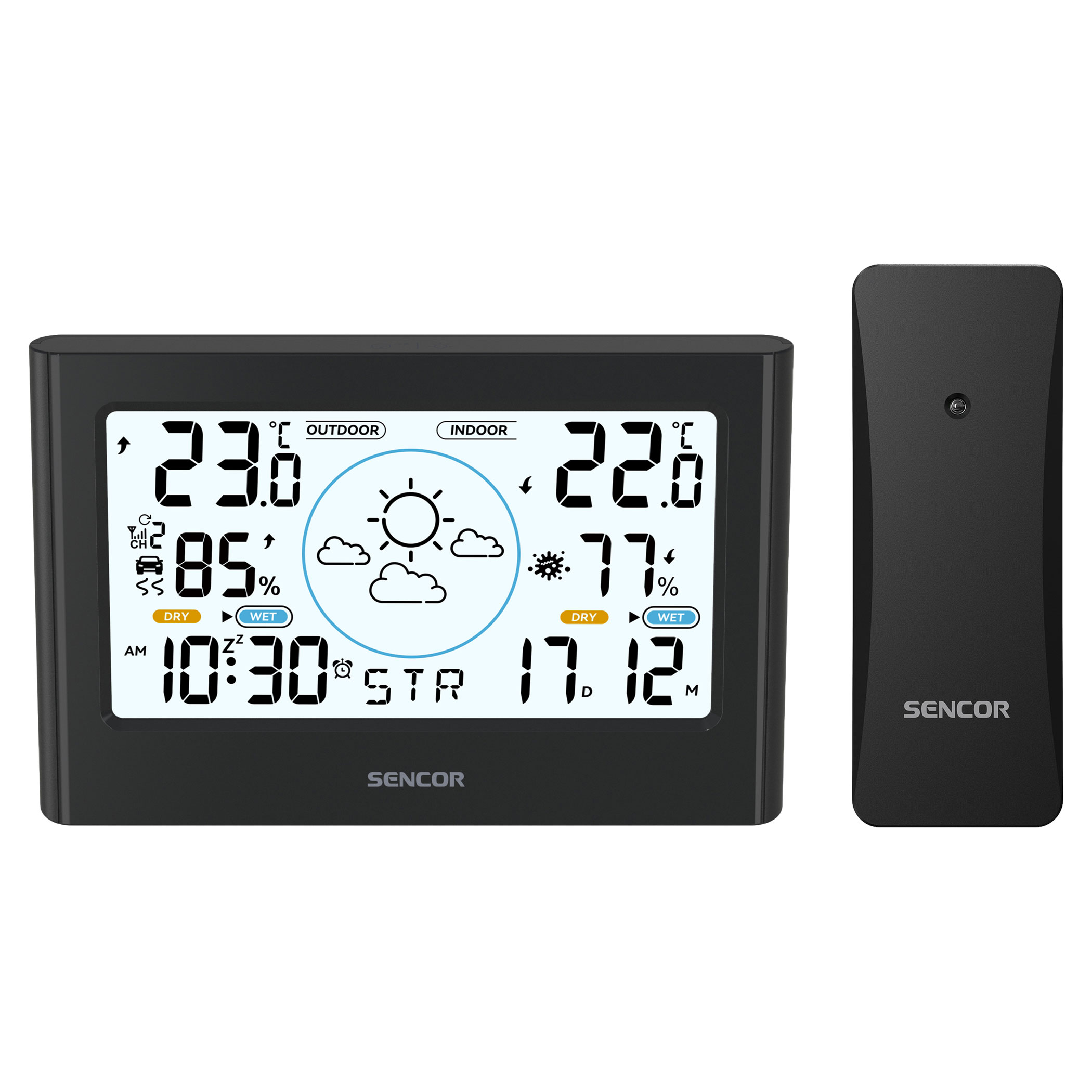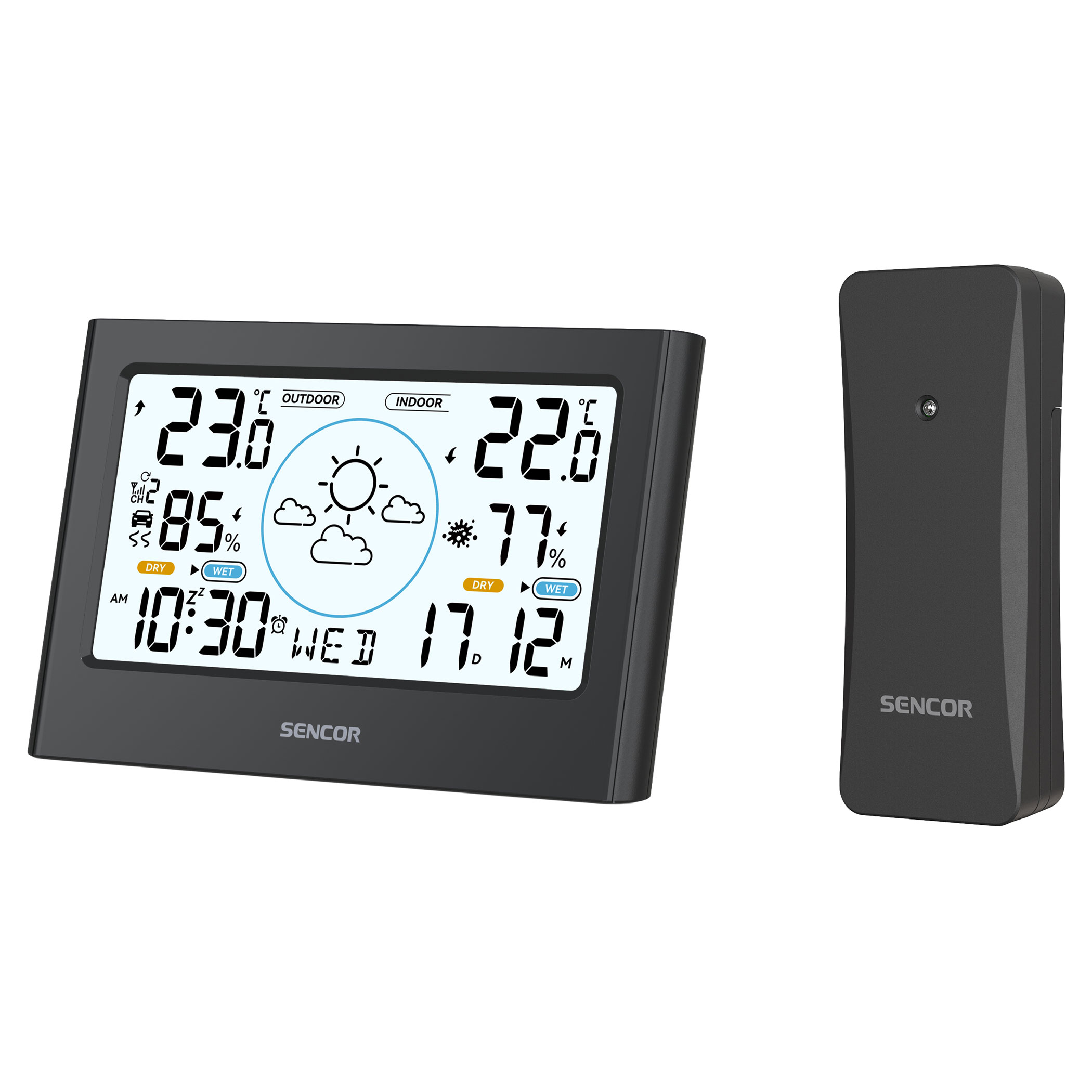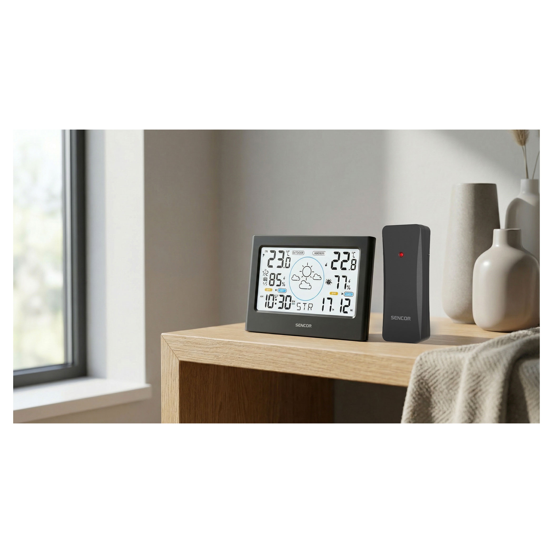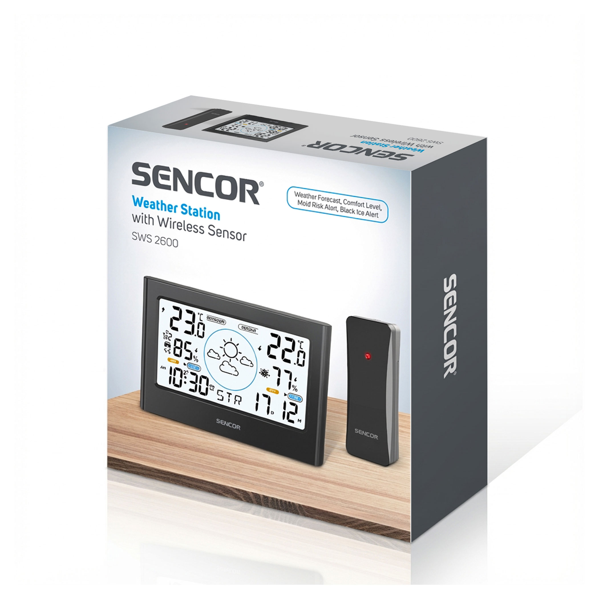 The Sencor SWS 2600 weather station accurately measures temperature and humidity thanks to a wireless sensor. It also warns of icy conditions, mold risk, and shows the current comfort level.