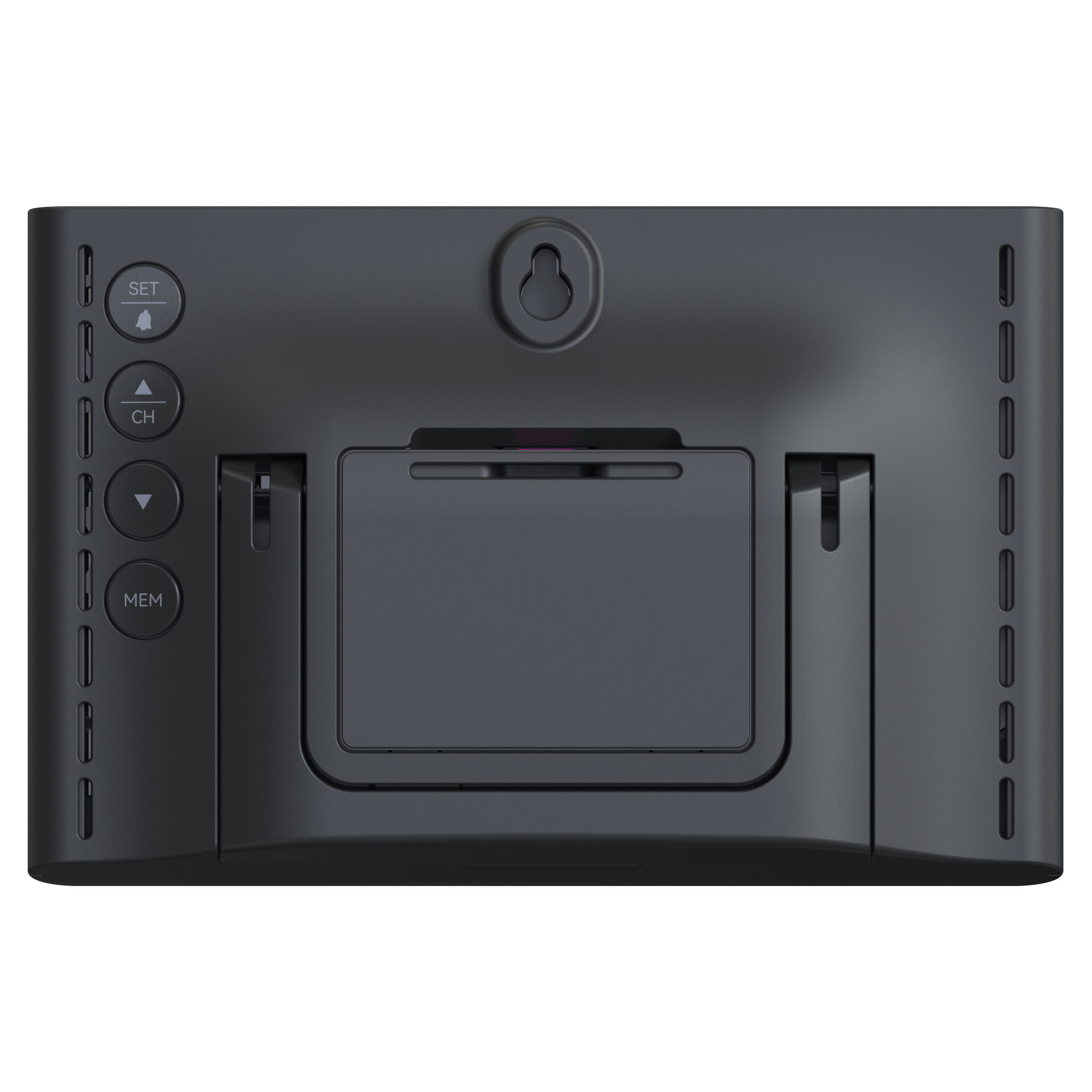 A weather station with a wireless sensor measures both temperature and humidity. It displays a weather forecast and features indicators for detecting comfort level, mold risk, or icy road conditions. Up to three sensors can be connected, and their measured data can automatically rotate on the display.