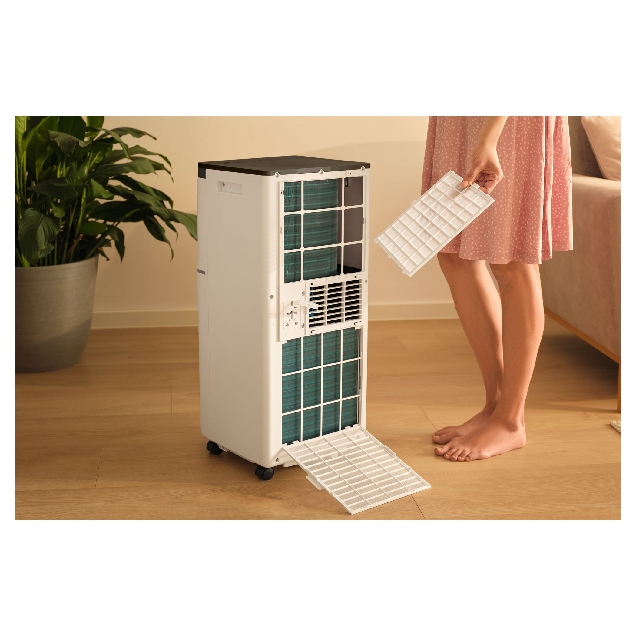 - Portable air conditioner unit including inflow and outflow air filters.